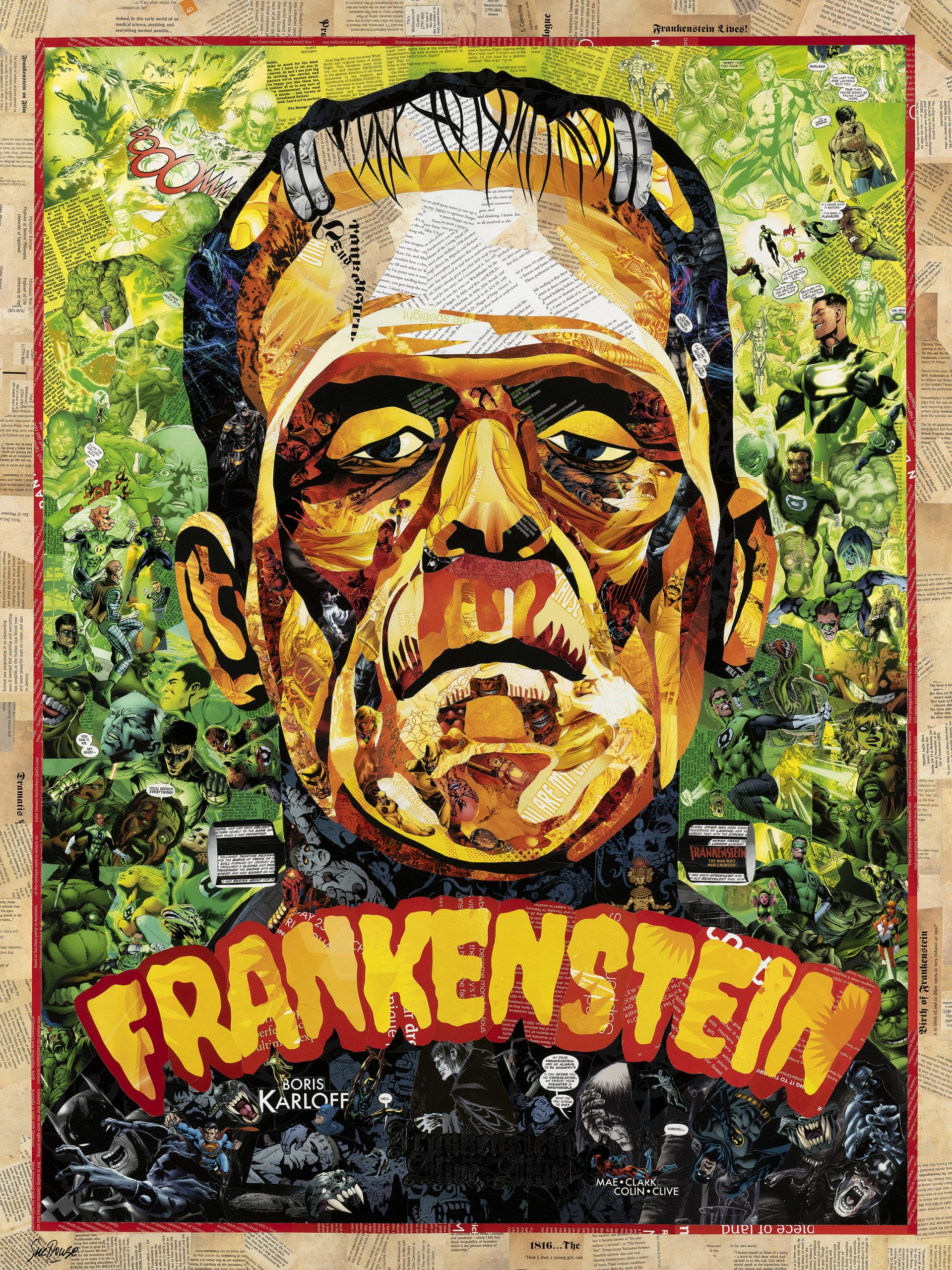 ‘Frankenstein’s Superheroes’ is a collage created entirely out of comic books using superheroes, villains and Frankenstein references. Scattered throughout the piece are roughly 70 superheroes, 95 creatures and villains, 50 Frankenstein images or text. Approximately 1,500 pieces of paper in total have gone into creating this classic old movie poster.