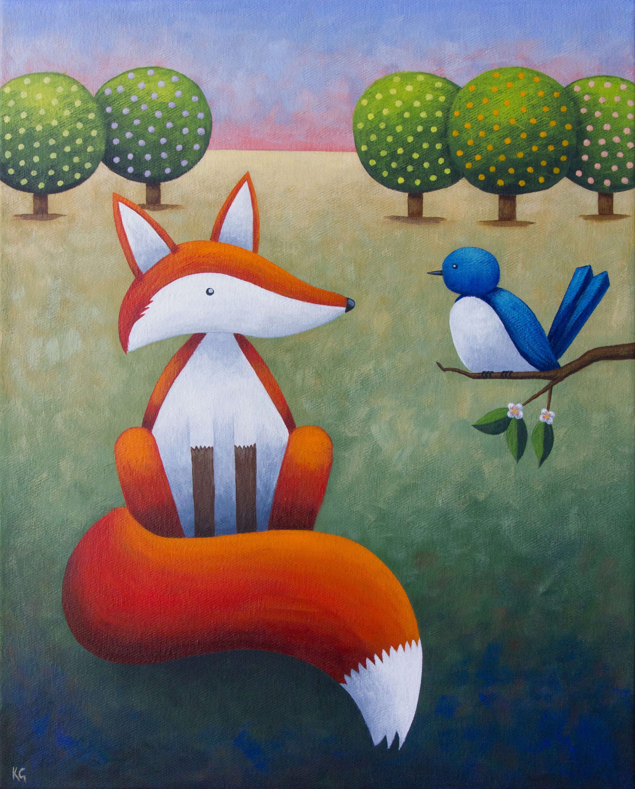Frankie and the Bluebird – Orchard by Kate Graham. Portrait of Frankie the Fox with a Bluebird, orchard in the background. This painting is a naive and whimsical scene, exploring the beauty of some of nature’s living creatures. Painted in a textured way to enhance the style. Part of a series of works revolving around the adventures of Frankie the Fox exploring the natural world and the wonders to be found throughout. This piece would make a great addition to any artwork or painting collection, whether it is in the home or office, living room or bedroom, or even the nursery or child’s room. Painted on quality canvas, hooks and wire on back so ready to hang. Sides also painted in a continuance of the composition, so no need to frame.
