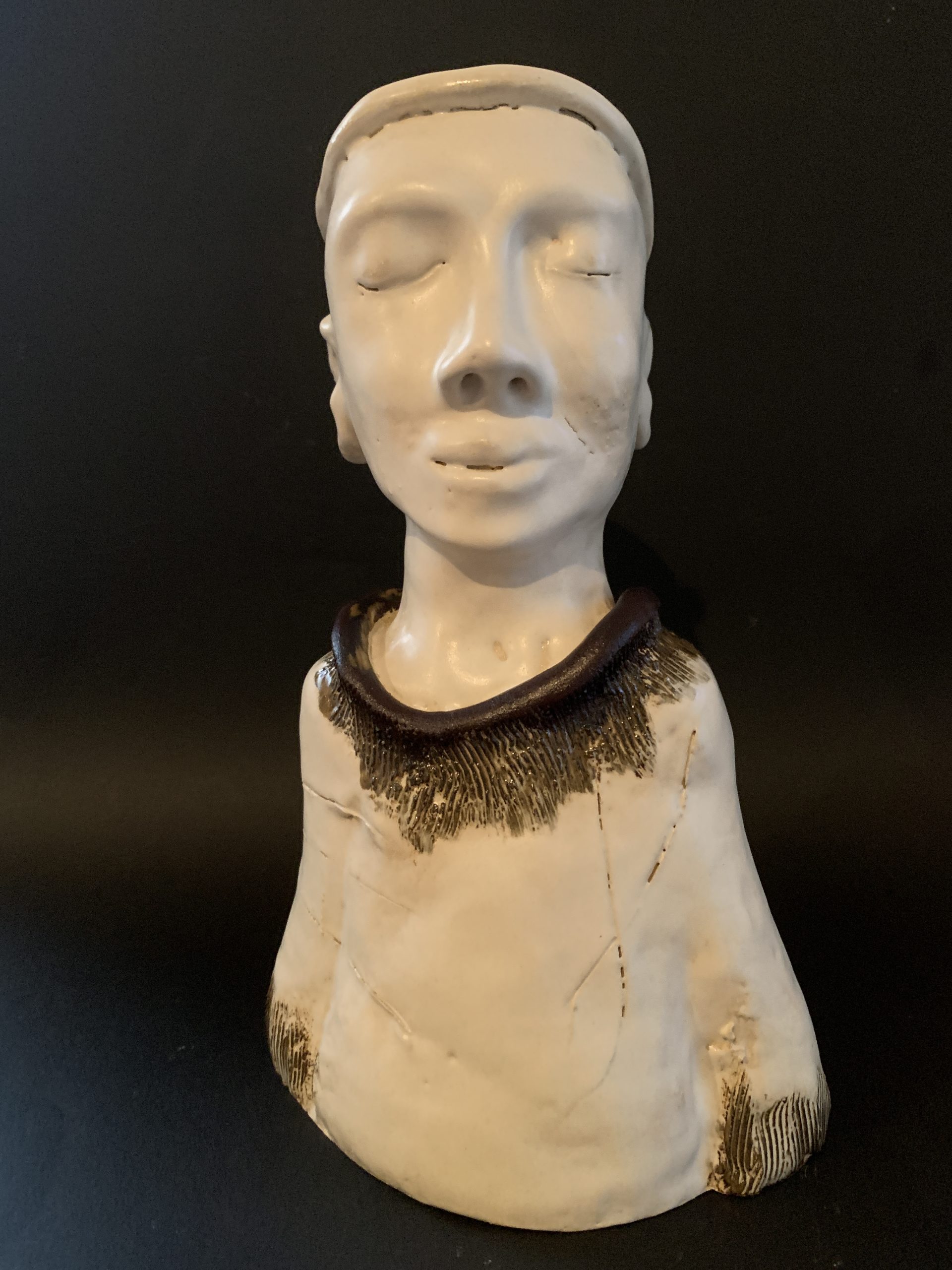Freddy by Kim Rees –Â Hand built figurative sculptured bust in fine sculptural clay, glazed.