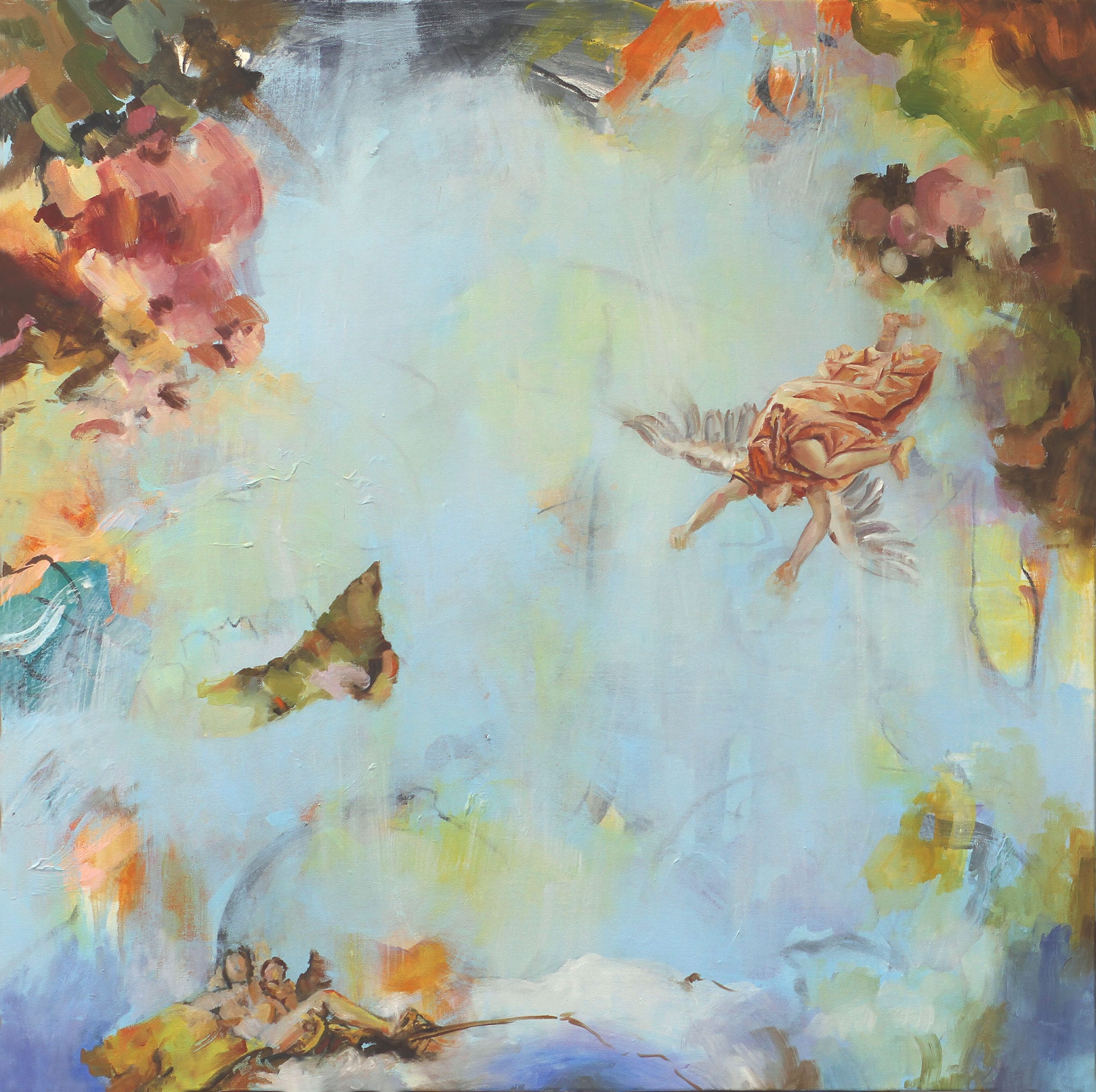 Painted in the Rococo colors and influenced by the Italian Master Tiepolo, “Free Falling” is my contemporary twist.