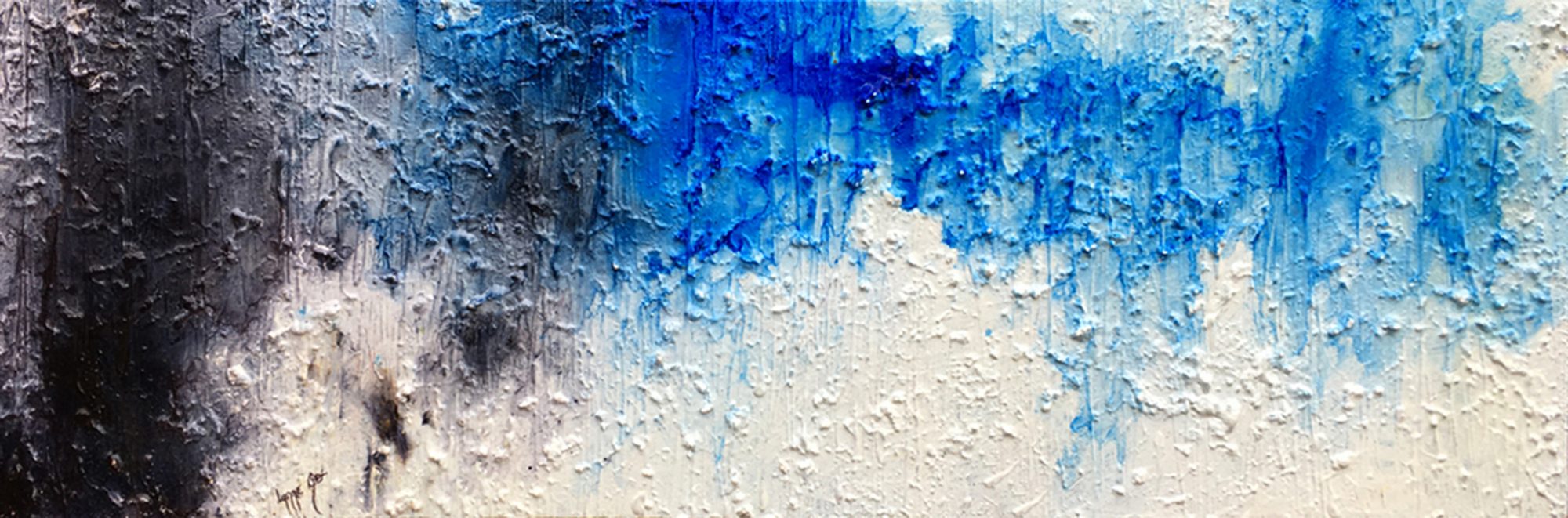 A highly textured abstract flowing with a vibrant azure blue blending into a grey and black palette.