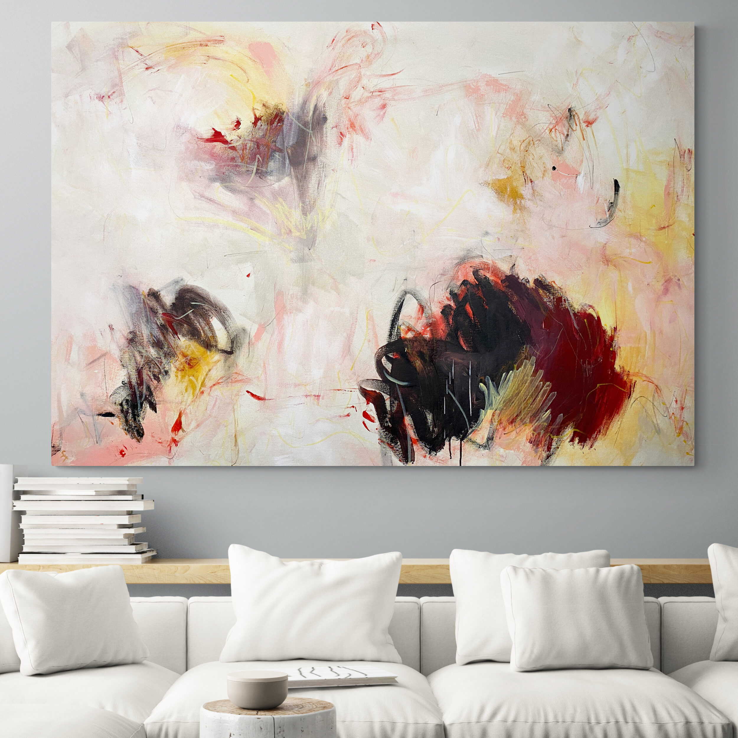It’s intriguing mark making combined with its restful and calm palette of beautiful soft blush and subtle pinks, warm reds and black, mixed with cool lemon yellows and earthy neutral tones.