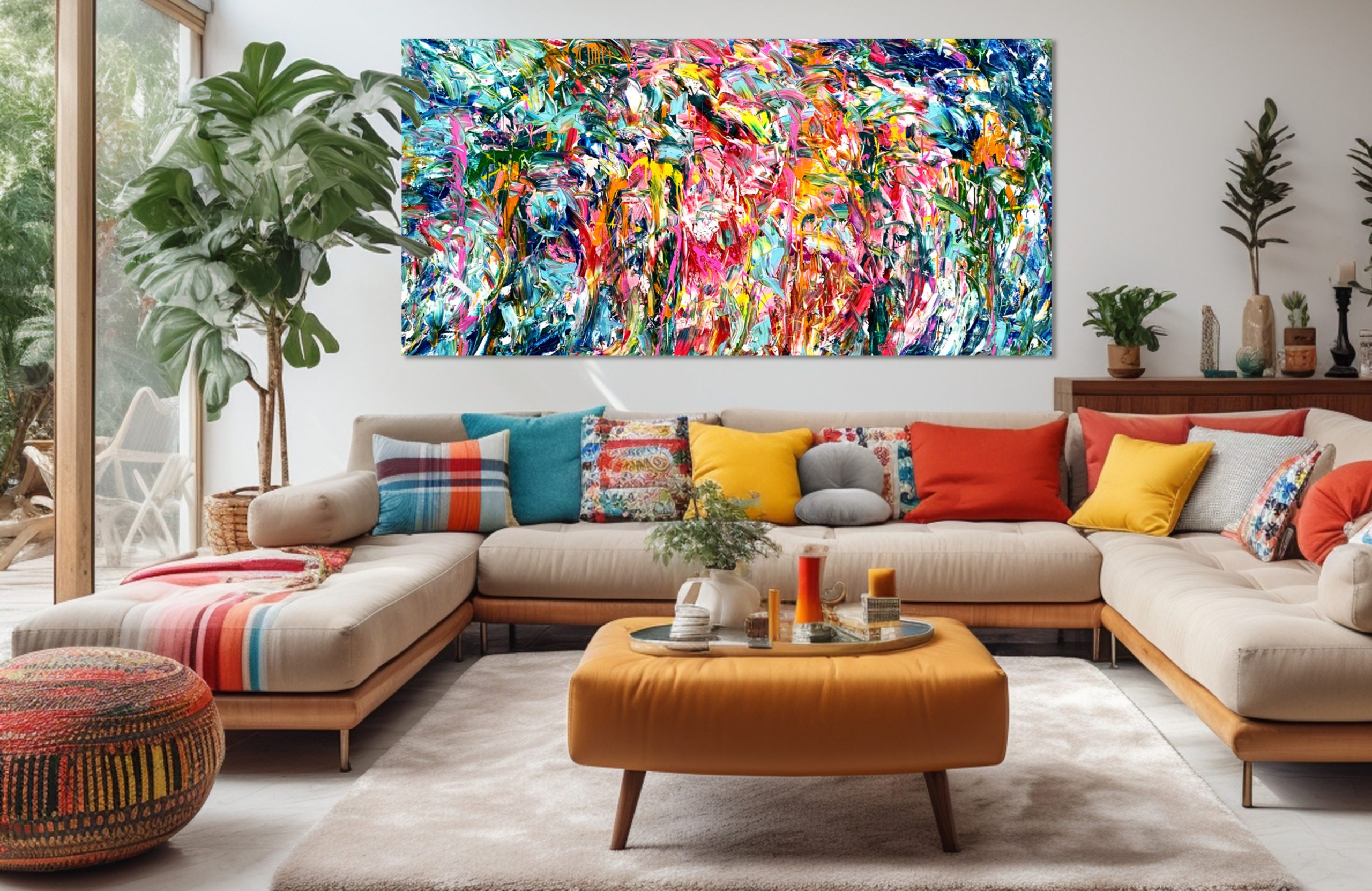 This artwork is painted on professional-grade canvas stretched and sealed with varnish. The canvas has dimensions 198 cm in width by 96 cm in height. The painting wraps around the sides of the stretcher, so the sides are painted in the same style as the surface. As such it does not need a frame, but framing options are available.