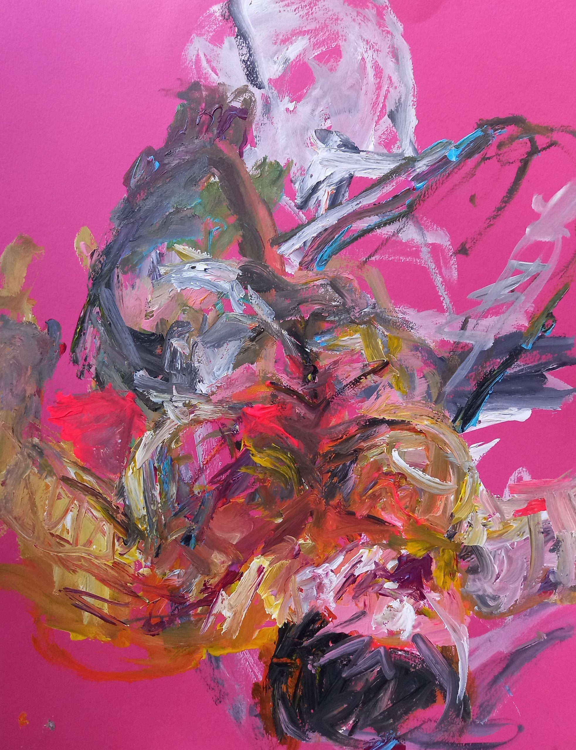 Loosely applied paint set against a striking pink background enabling a lovely sensual atmosphere of colour. A reclining figure abstractly lies in these lucscious colours.