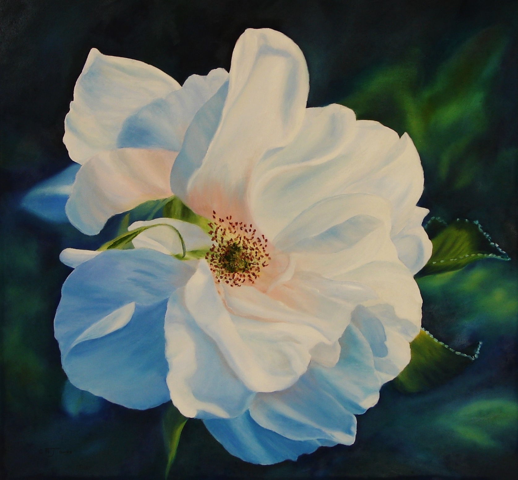 This is a beautiful Fine Art print on Archival Rag Paper. It is a reproduction of an Oil Painting of the Rugosa Rose “Blanc Double de Coubert ” which flowers in my garden (when the possums don’t eat it!)   The actual print is 20cm x 20cm and including the mat is 30cm x 30cm and is ready to be framed. It will be shipped flat with excellent packaging. A Certificate of Authenticity will be included. Signed and numbered.