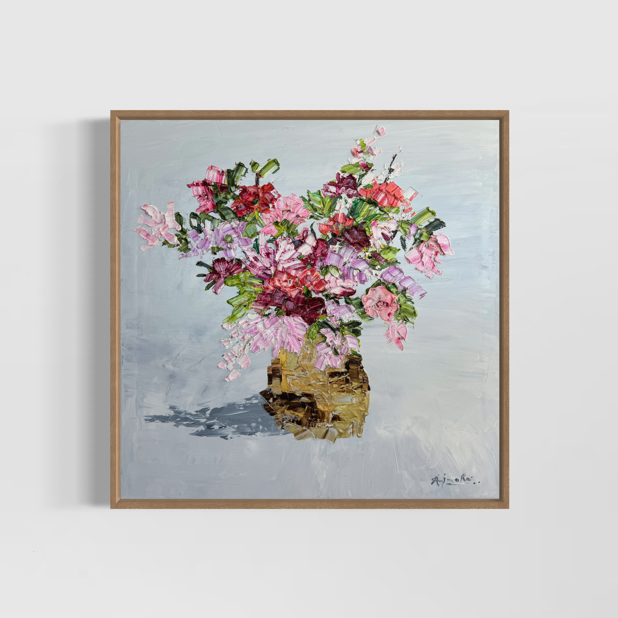 This artwork is  painted using impasto technique with palette knife and is framed in oak floater frame, ready to hang.