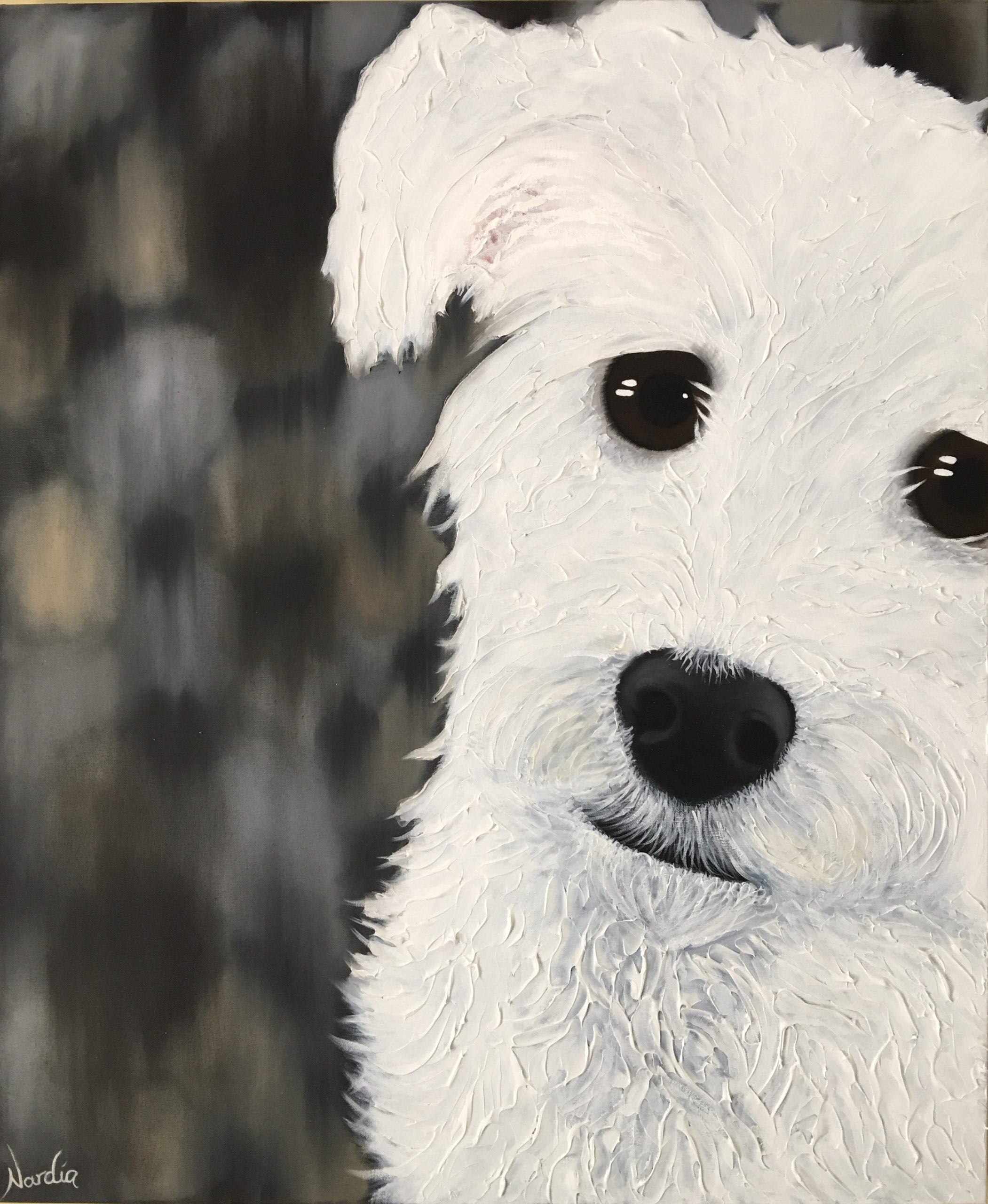 A very popular choice of furry friend is the little white dog. This one will greet you permanently with its quizzical gaze. Impasto was used to create the fur texture for a realistic interpretation, finished with acrylic and oil.