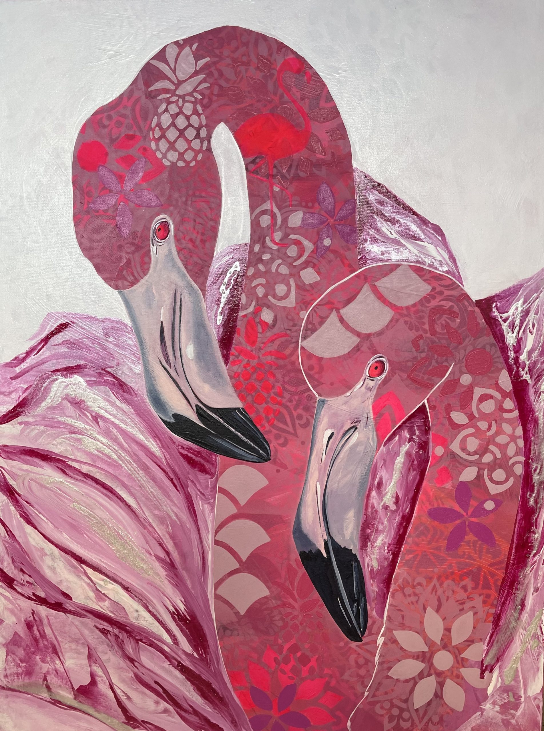 This painting is a playful experiment with silhouettes and overlaid pattern. An initial base layer was built up with acrylic paint and a catalyst wedge followed by spray painted stencil work. The two flamingos were then added and the background covered with white. Some of the stencil designs were then reapplied with acrylic paint to make them pop a little more. I am a bird lover at heart and I’m inspired by the beauty of flamingos.
