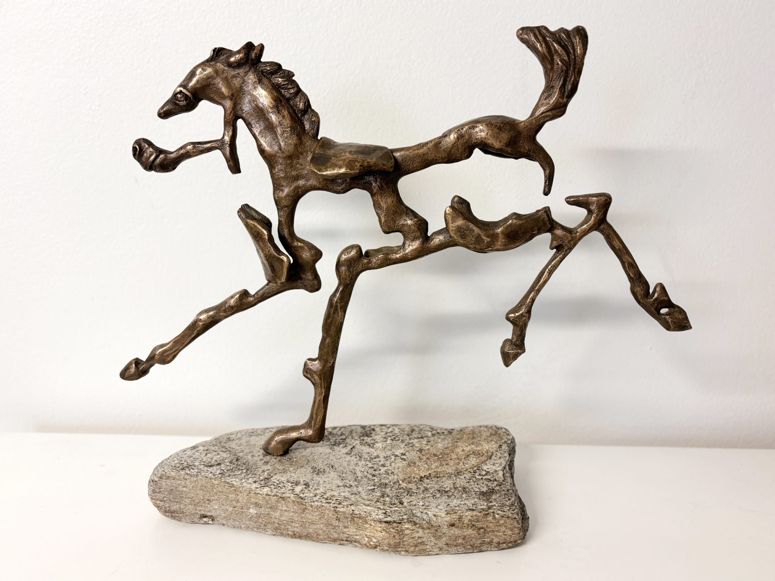 Frolic – by Helena Lillywhite – Â I grew up on a riding school, deeply connected to horses, creatures of power, freedom, and spirit. My Horse Series sculptures are not literal forms but evocations of movement and essence. Fragmented bronze, shifting light, and rough stone bases express their primal energy. Each piece is named after a real horse from my childhood, making the series both tribute and memory, a bridge between past and present, body and spirit.