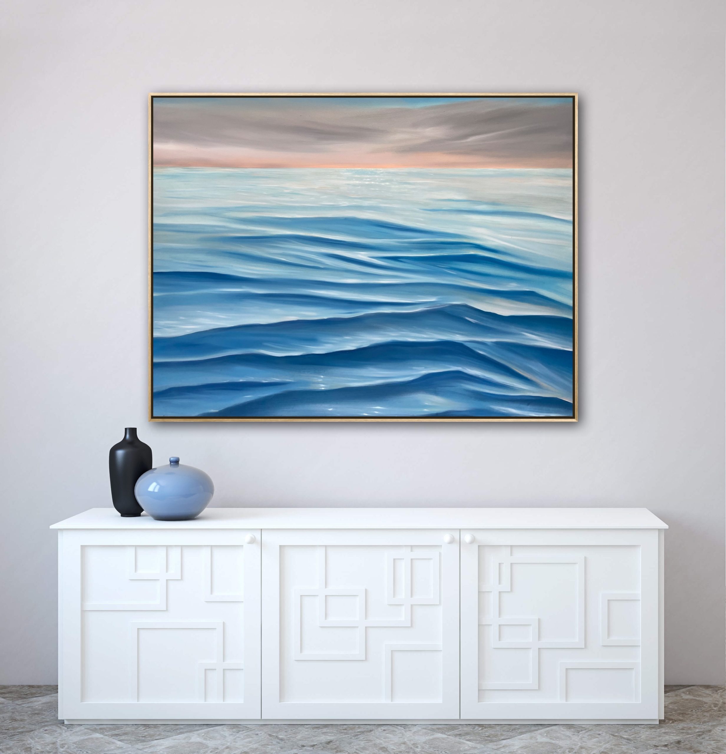 From watching a sunset or sunrise, even with grey clouds, it’s always a show stopping scene & the ocean has the ability to calm our minds. Allow this painting to add length in your room with the horizontal lines of the waves.