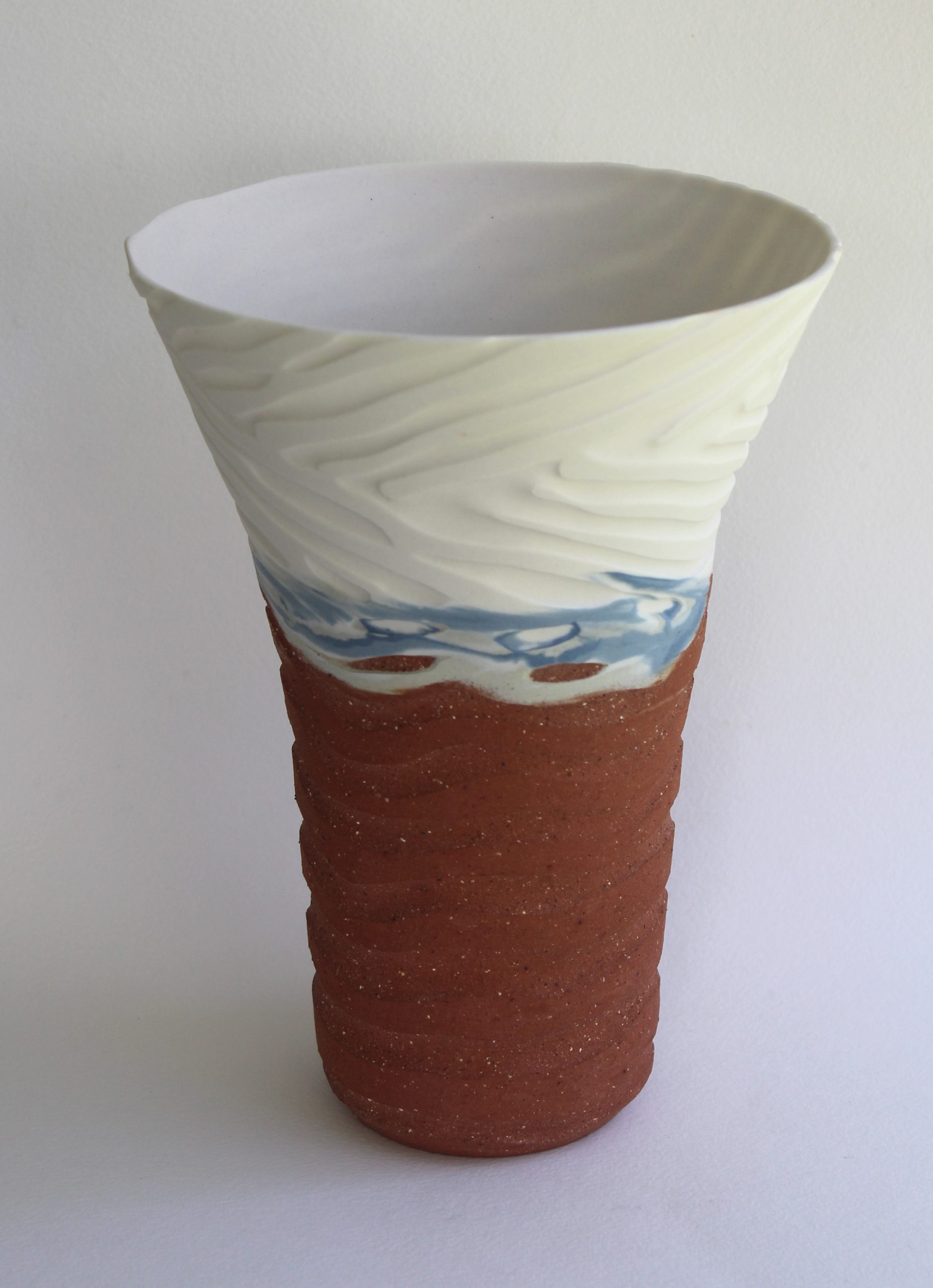 Techniques used include wheelthrowing with a combination of fine porcelain, coloured porcelain and textured terracotta clays. The porcelain surface has been water etched to give a feeling of coastal landscapes. It is more a sculptural form than a vase, as due to the unglazed surface it is not suitable as a water container.