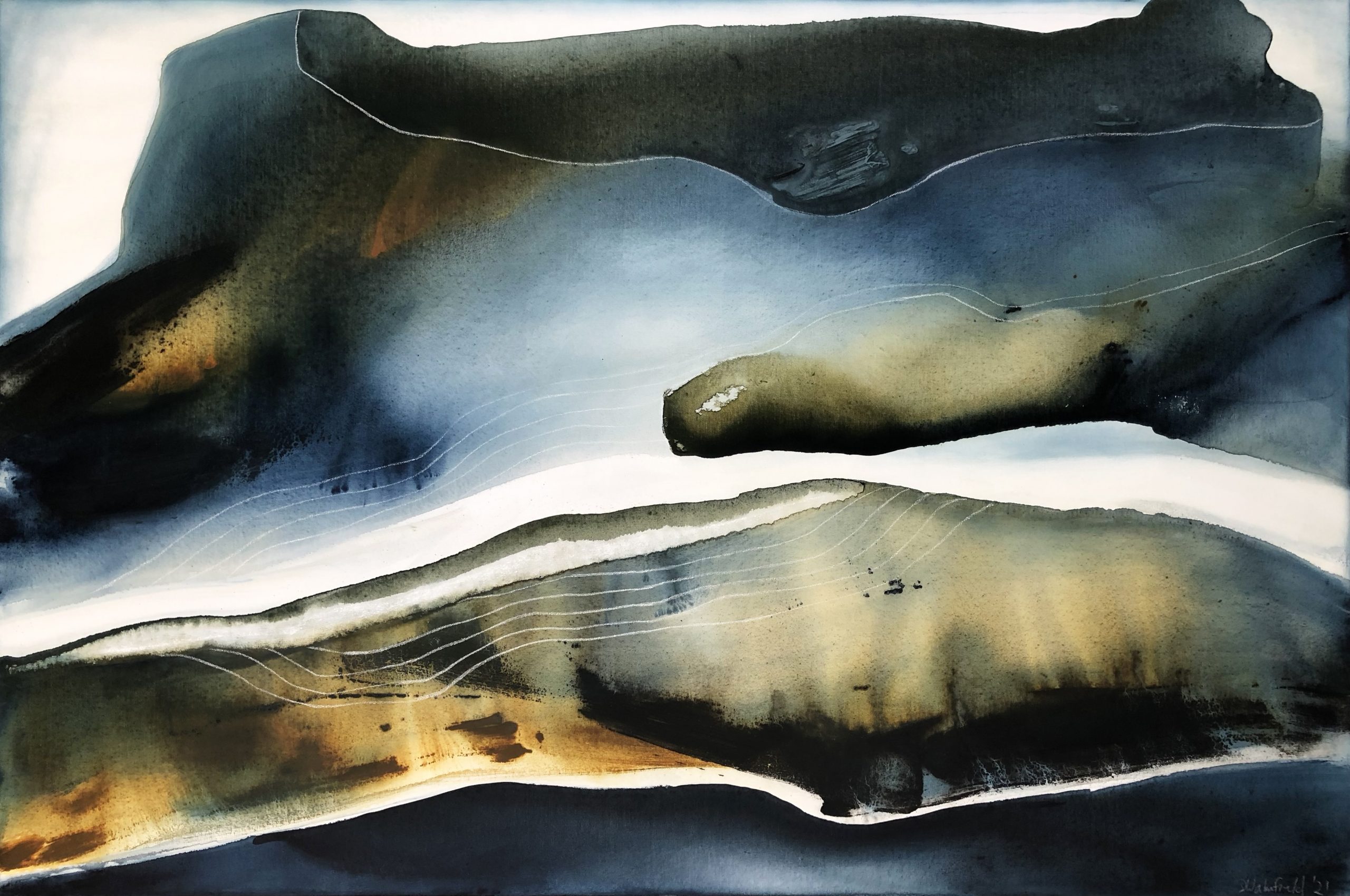From the far side of the Ocean by Dinah Wakefield is inspired by the light, the colours and the natural beauty of the Noosa region of Australia. “What I love most about Noosa is the interplay of light. From the oceans to the clouds, to the river estuaries and the hinterland, this canvas unfolds before me every day and finds expression in my paintings”.
