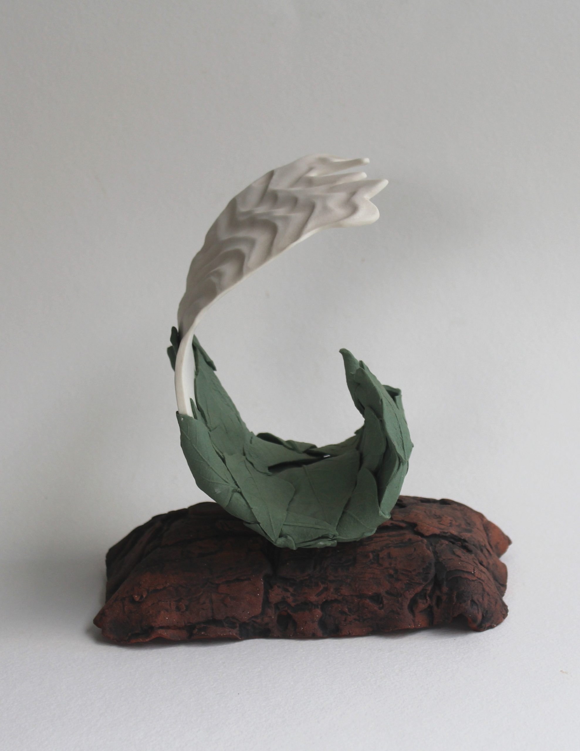 This ceramic sculpture is part of a series based around the landscapes, from coastal to rural, we enjoy in Australia.  I collect various leaves on my walks in the forest. On taking them back to my studio I create latex moulds from them. I am then able to press clay into the latex to create a clay replica of the individual leaves. Each green leaf is individually applied to the from. The white porcelain section has been water etched to give the feeling of a coastal landscape. The form sits on a textured terracotta base which further creates the feeling of a landscape.