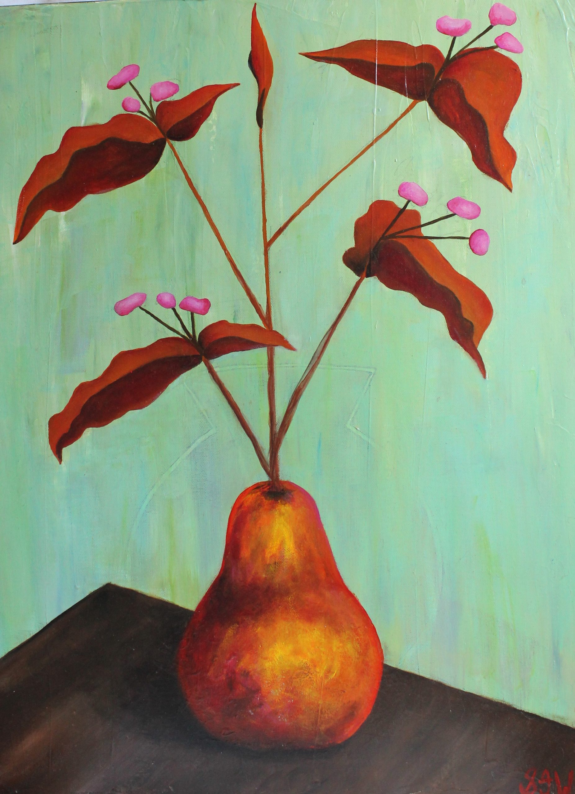 From within by Sarah Walker – This piece is a re-work of a previous piece that I was unsatisfied with. I like the idea of seeing the fruit and blossom all in one piece, with the pear fruit itself playing the role of a vase as well. Fruit to root, and then seed to ground again, in a continuous cycle. A process of renewal from within. I like the process involved in painting over previous works, and I often leave some evidence behind of the work underneath. It’s a mark of growth in itself.