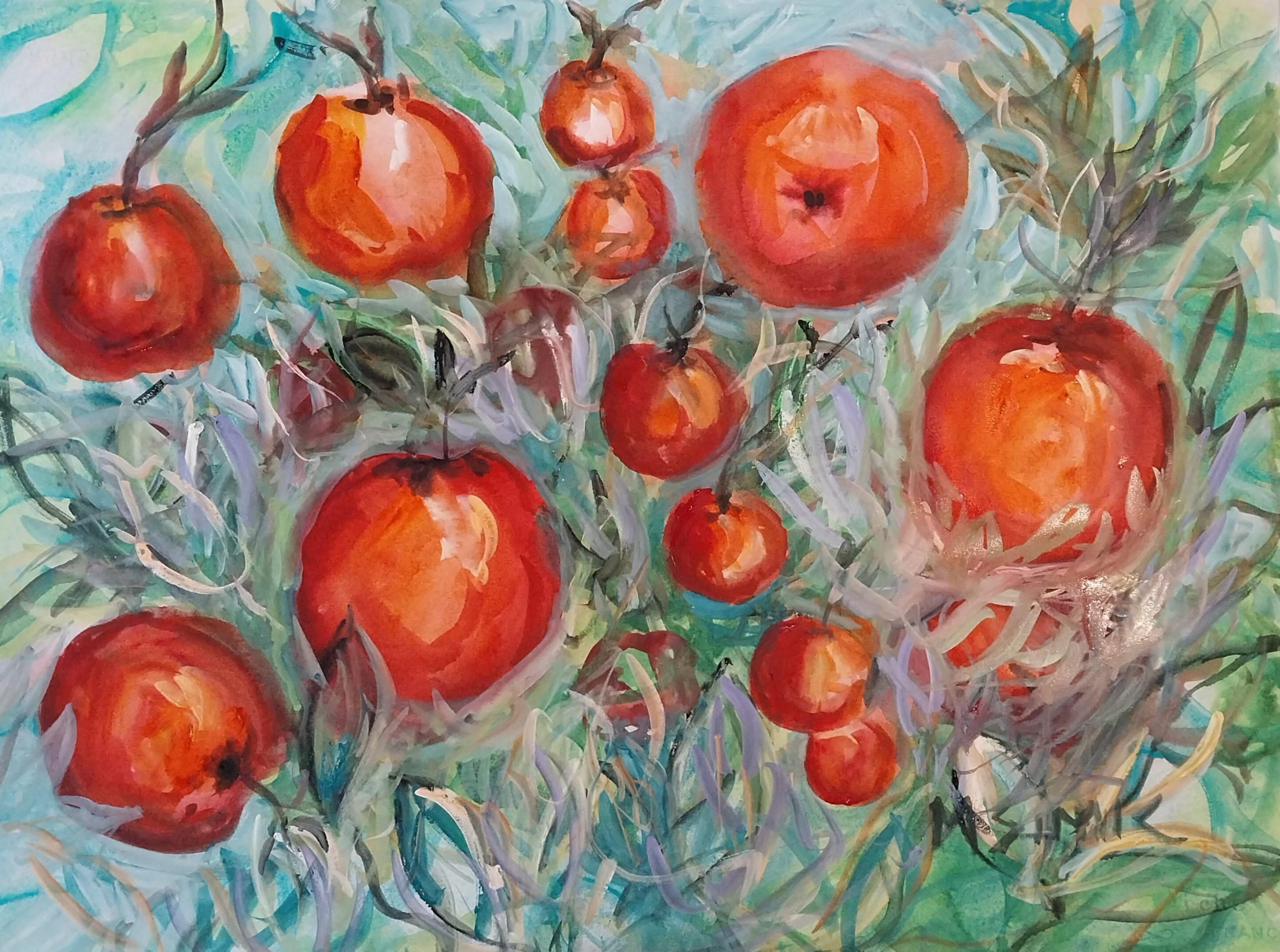 I saw a beautiful bunch of apples on an apple tree and I thought they looked so decorative with the branches displaying a jumbled pattern of leaves, just like a Christmas tree. In Germany, the originator of the Christmas tree, Christmas trees were adorned with apples before any baubles were developed. This painting is a mixture of apple tree and Christmas tree.
