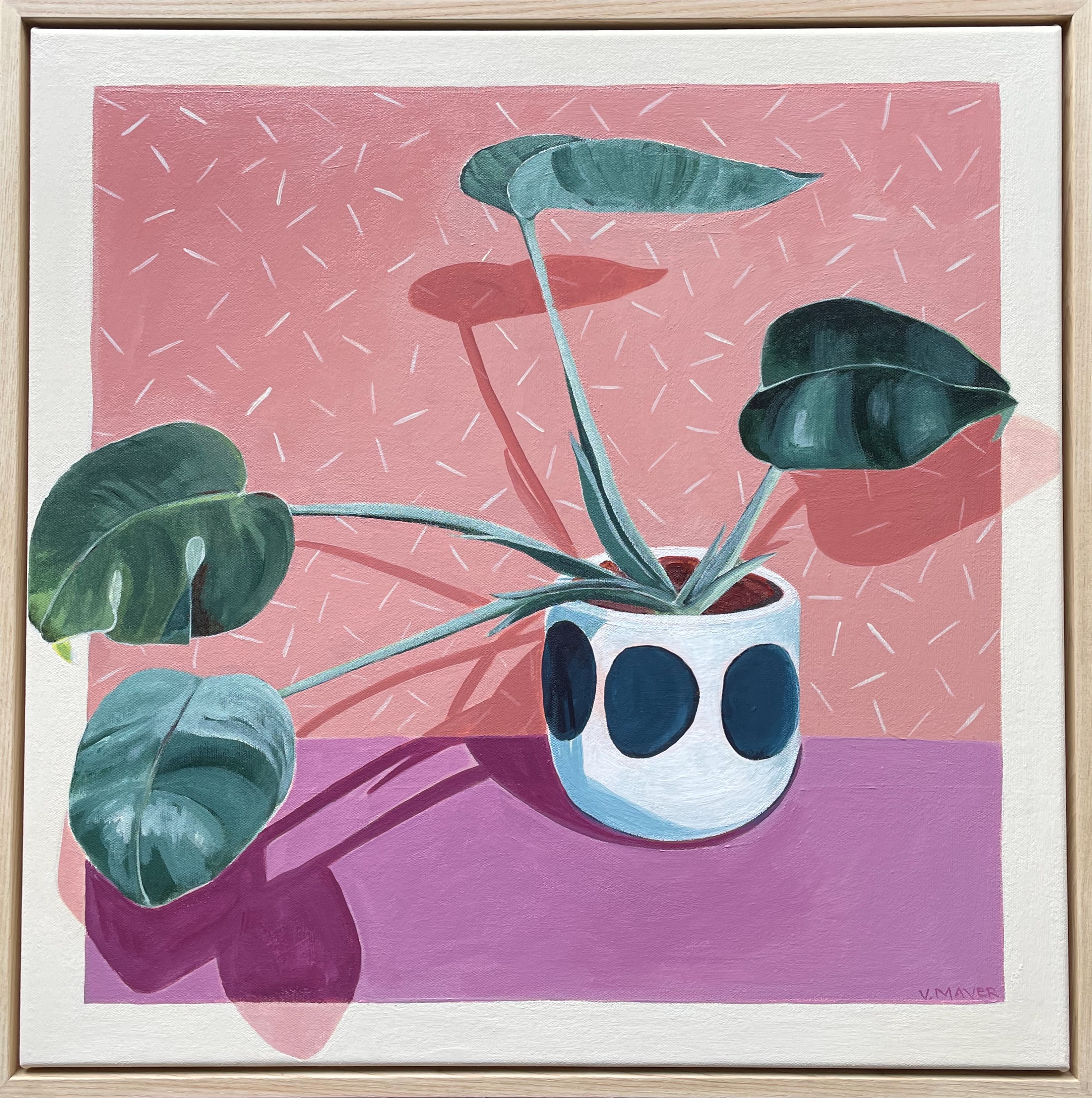 Fruit Salad by Vanessa Maver – Featuring my milk & Sugar plant pot, that turns up a lot in my paintings, with one of my prized Monstera plants basking in the sun. This one is a fun, colourful and whimsical piece, that would brighten any dull wall.
