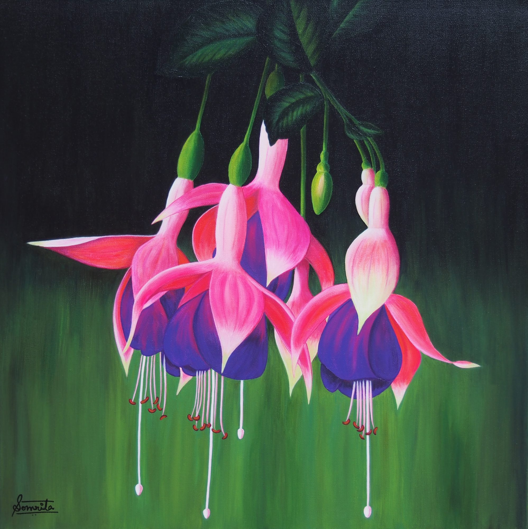 Fuchsias symbolise confiding love and make for a great gift representing trust and understanding. They are one of my favourite flowers so I had to include them in my floral series. This contrasting fluro pink with purple is my favourite combination although I must say that any colour combination of these flowers looks great.