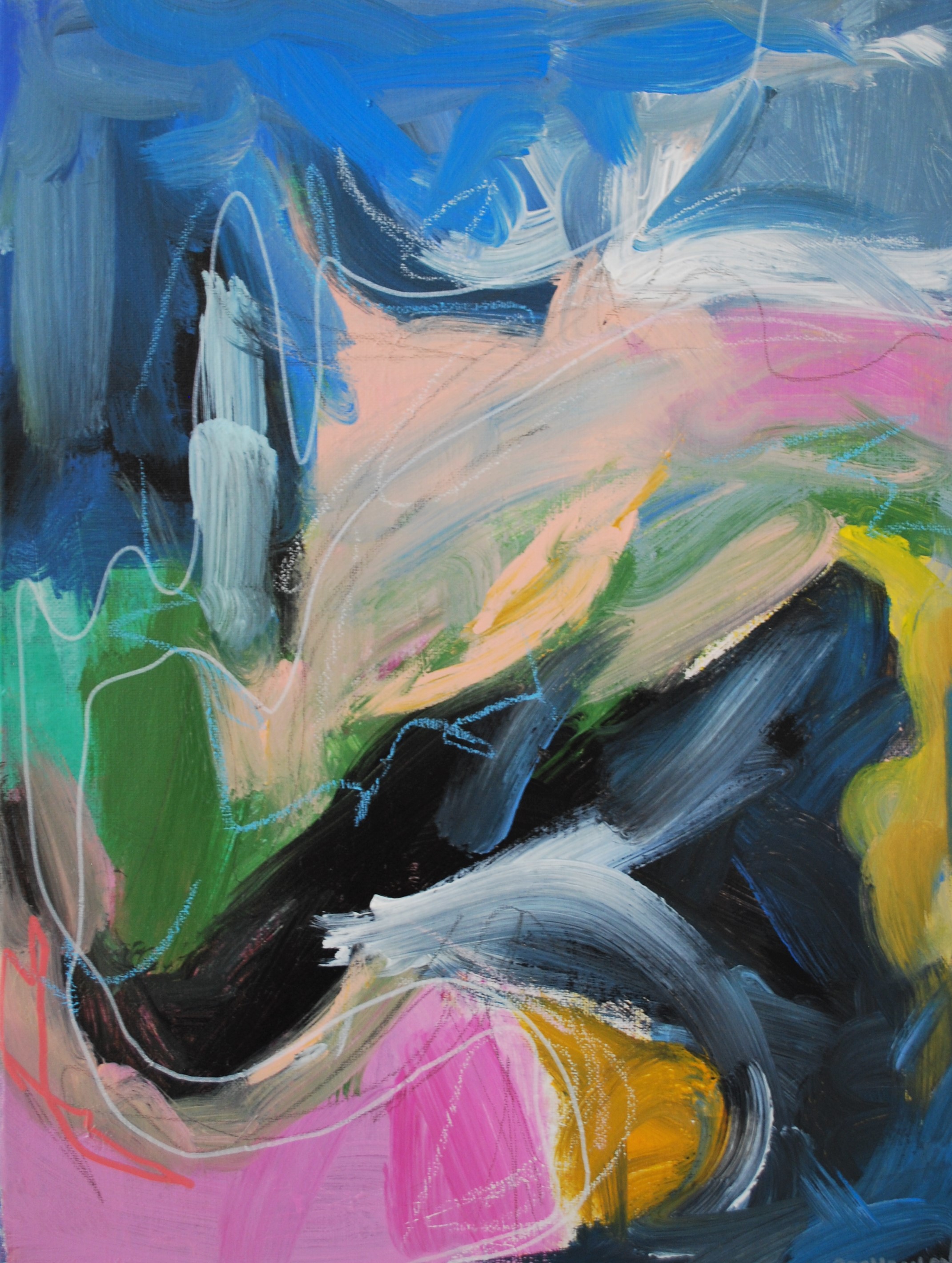 Full of Life I – This work is part of my exploration of a process driven art practice with emphasis on play and experimentation. I work mainly in acrylic and a variety of mixed media (oil pastels, pencil, graphite, makers) on canvas and paper. Using a dynamic process of layering, marking making, texture and colour, I strive to be fluid and spontaneous in my work.