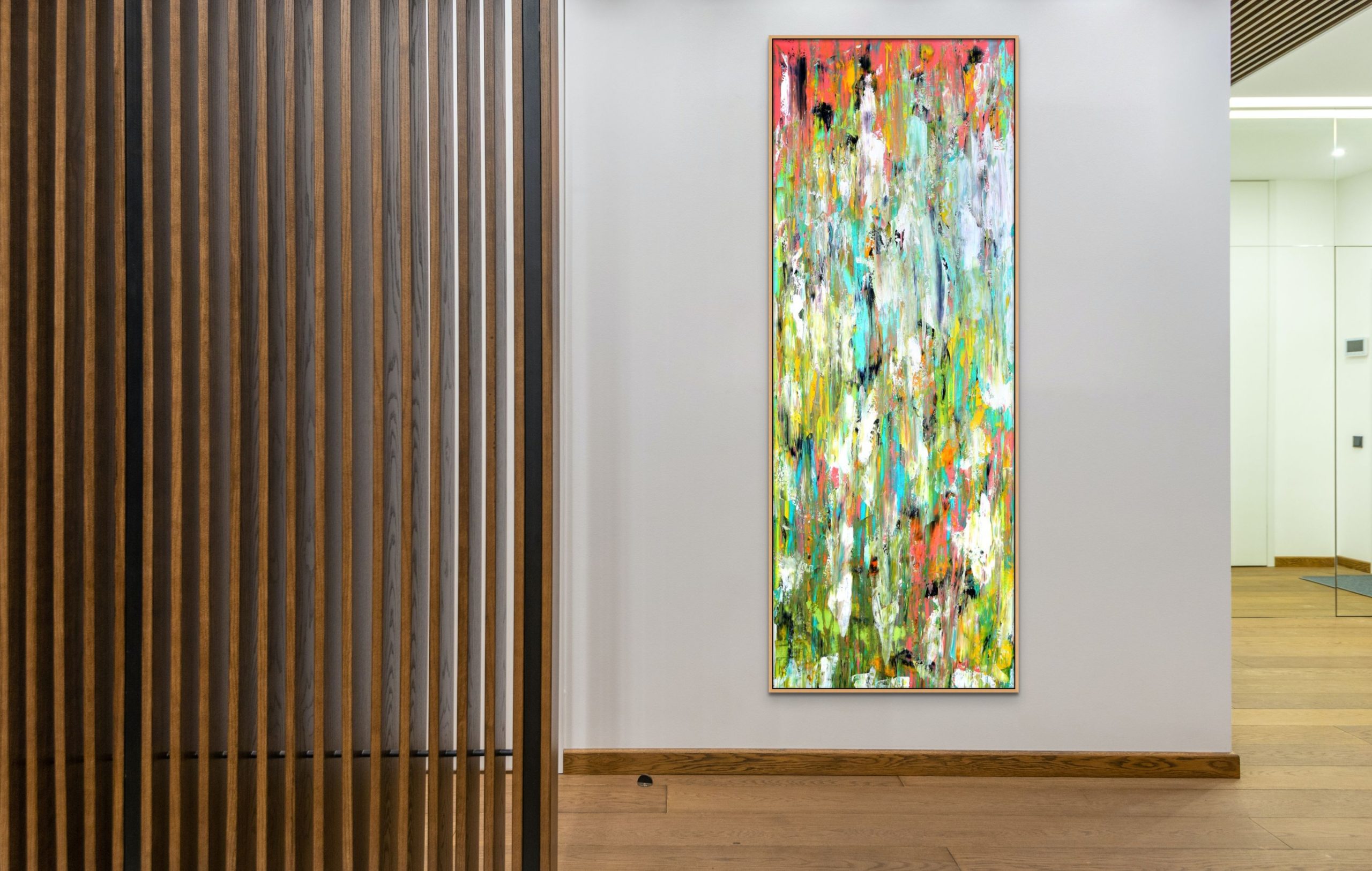 Each canvas is 68 cm (W) x 184 cm (H). The sides are painted in the same manner as the surface so no frame is required. The painting was created with Synthetic Polymer on a professional stretcher. The image shown has a floating frame, purely for illustration purposes.