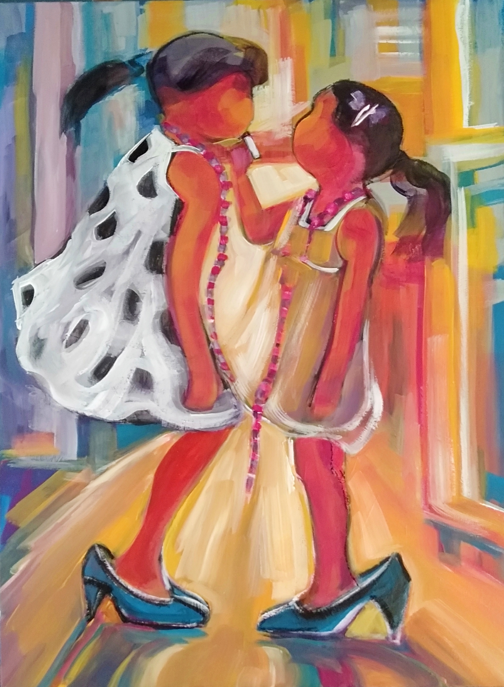 Fun and games original artwork by Angela mulligan .modern impressionist work girls having fun playing dress ups. Satin varnish finish.