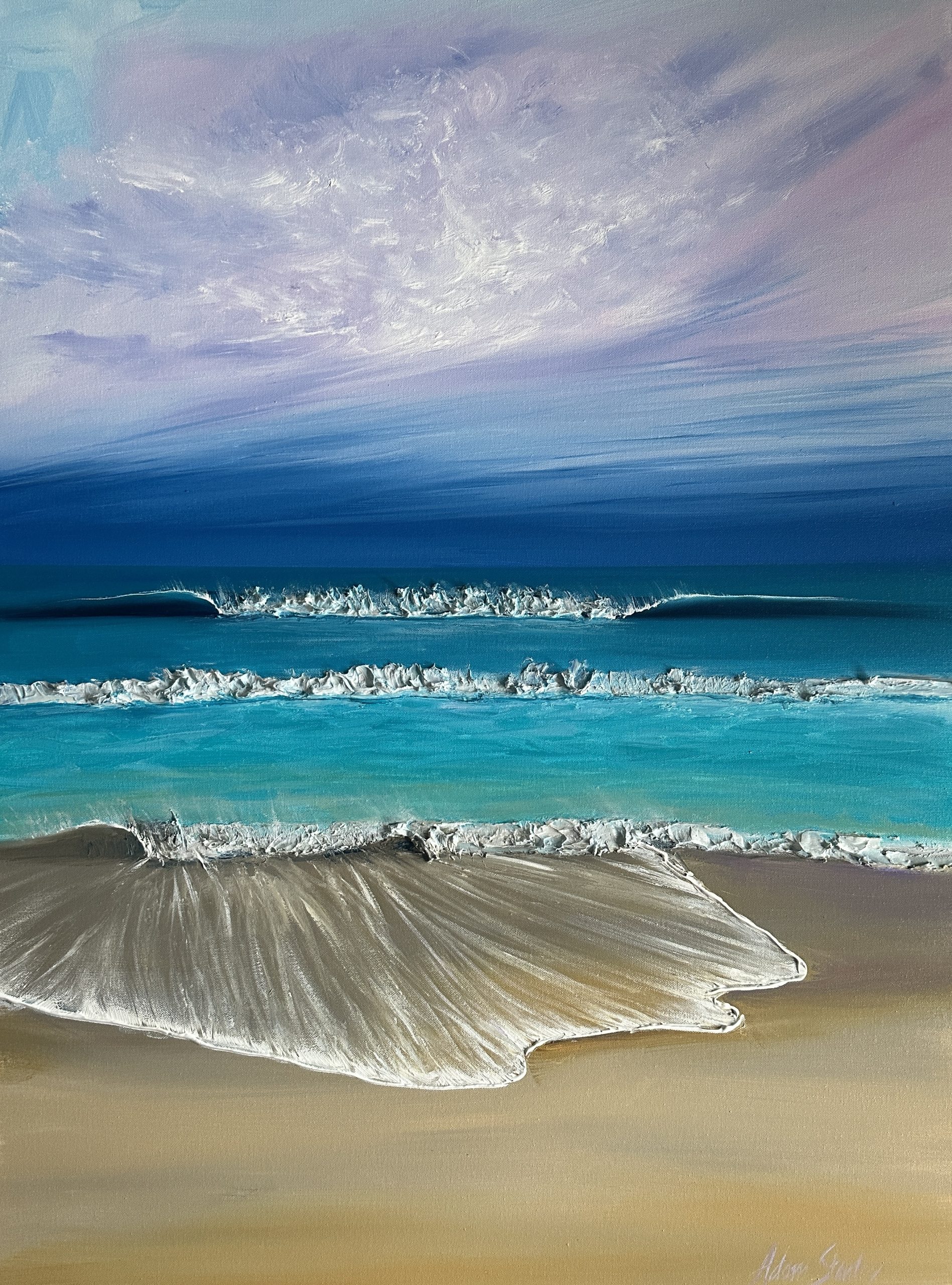 In this painting, I have tried to capture the water movement and waves crashing at the beach with my favourite colours
