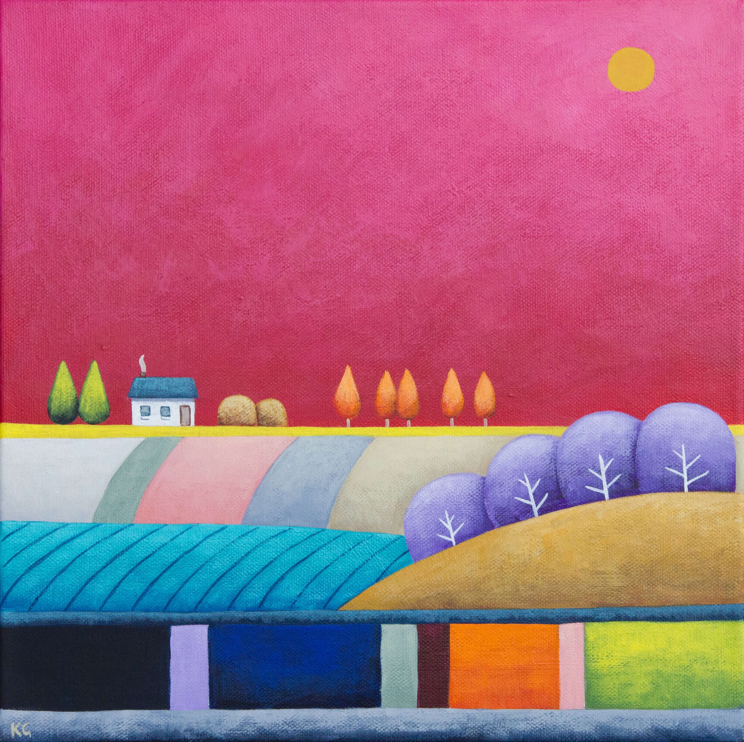 This small, square daytime scene features a soaring pink sky with rolling hills at the base of the composition, a house on the horizon and trees throughout. Piece is a contemporary take on the naive style of painting, with semi-abstract elements. Its smaller size makes it perfect for those spaces that need a pop of colour. Painted on quality canvas, wire on the back ready to hang. Sides painted in continuance of composition so no need to frame.