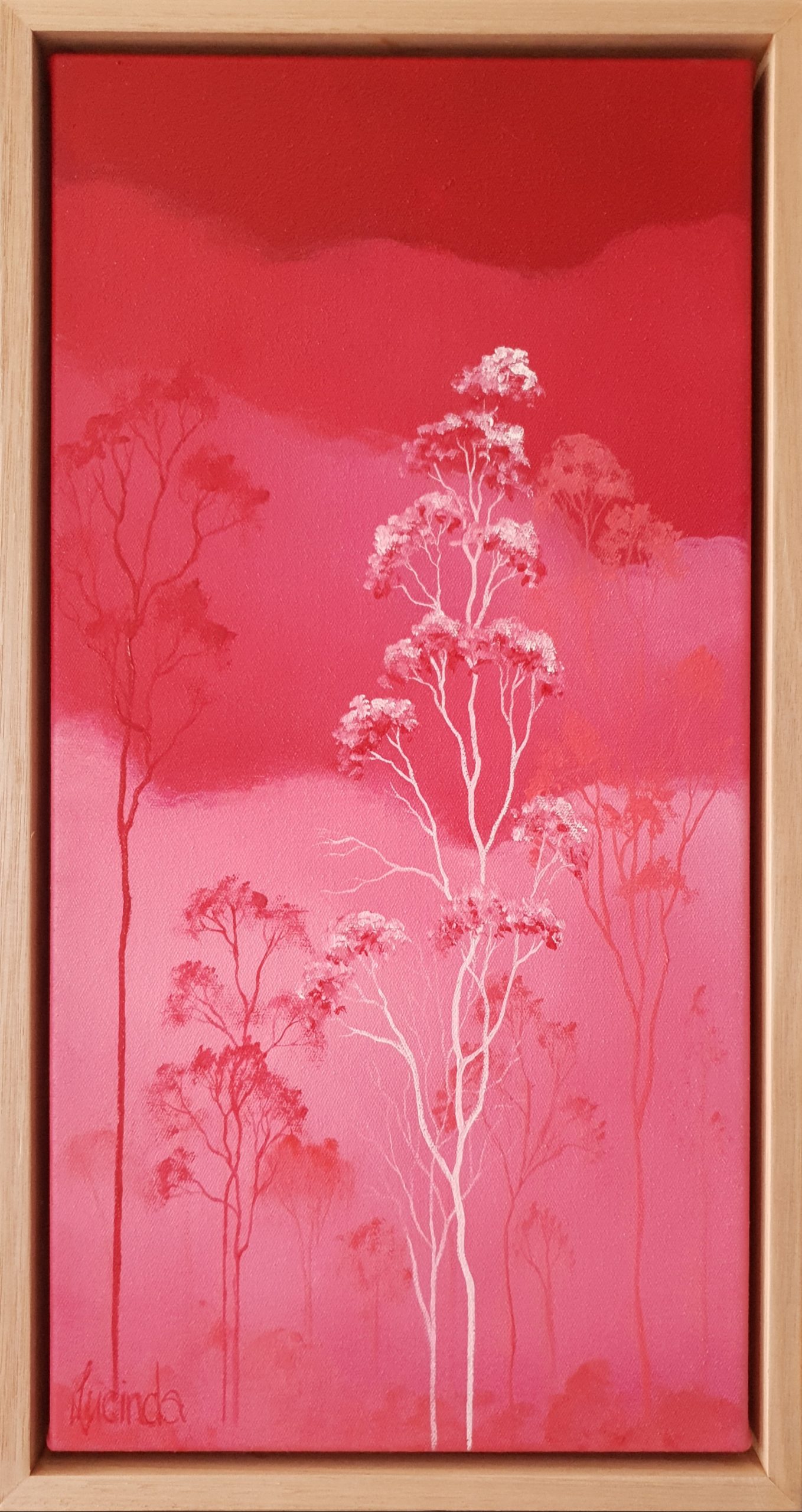 The artwork is on gallery style stretched canvas and the colour is continued round the sides, this piece is ready to hang with an Australian Oak floating frame approximately 5 cm deep.