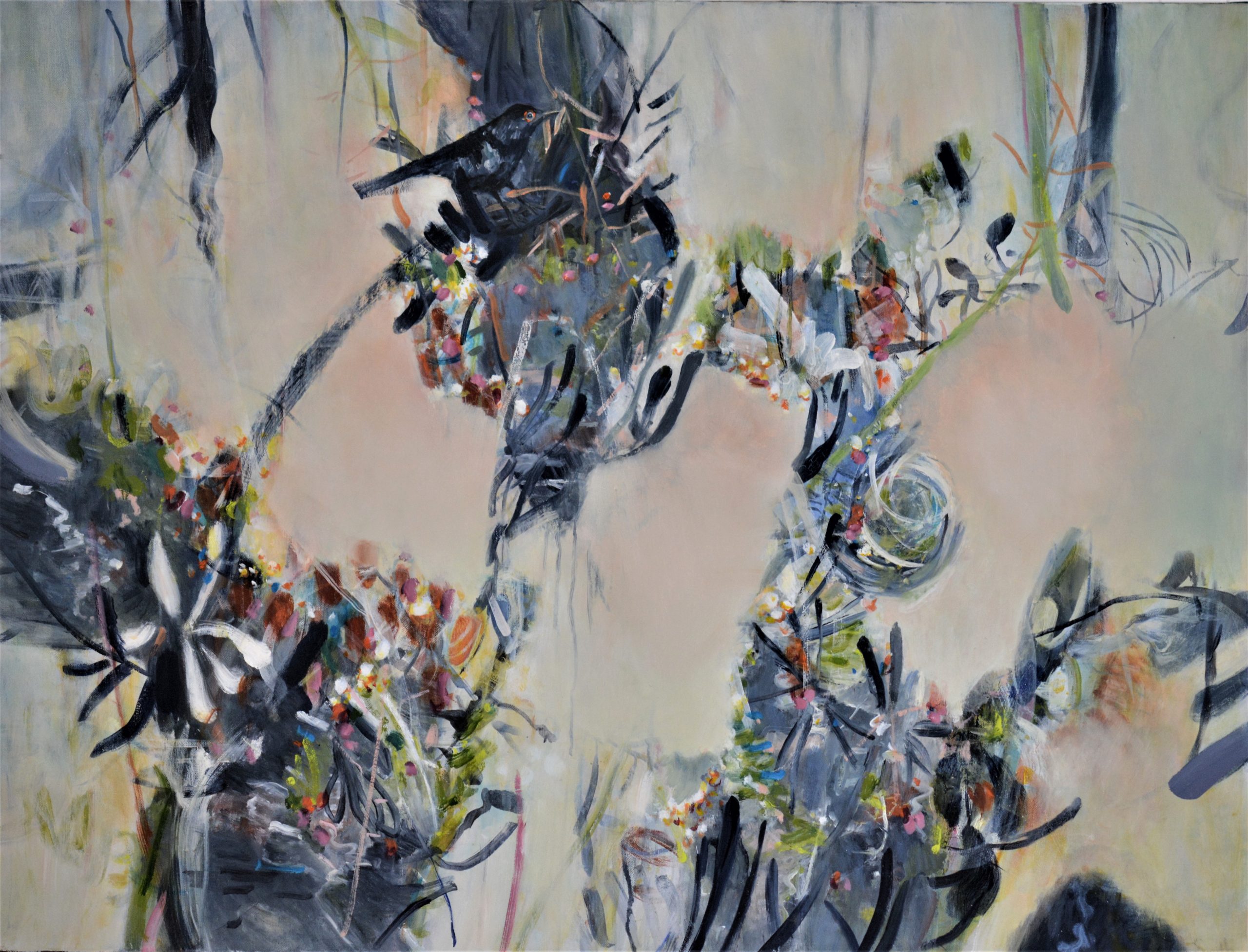 “Fusion” is inspired by a random moment where a bird rests and bright sunlight on water interacts with foliage in a local creek.