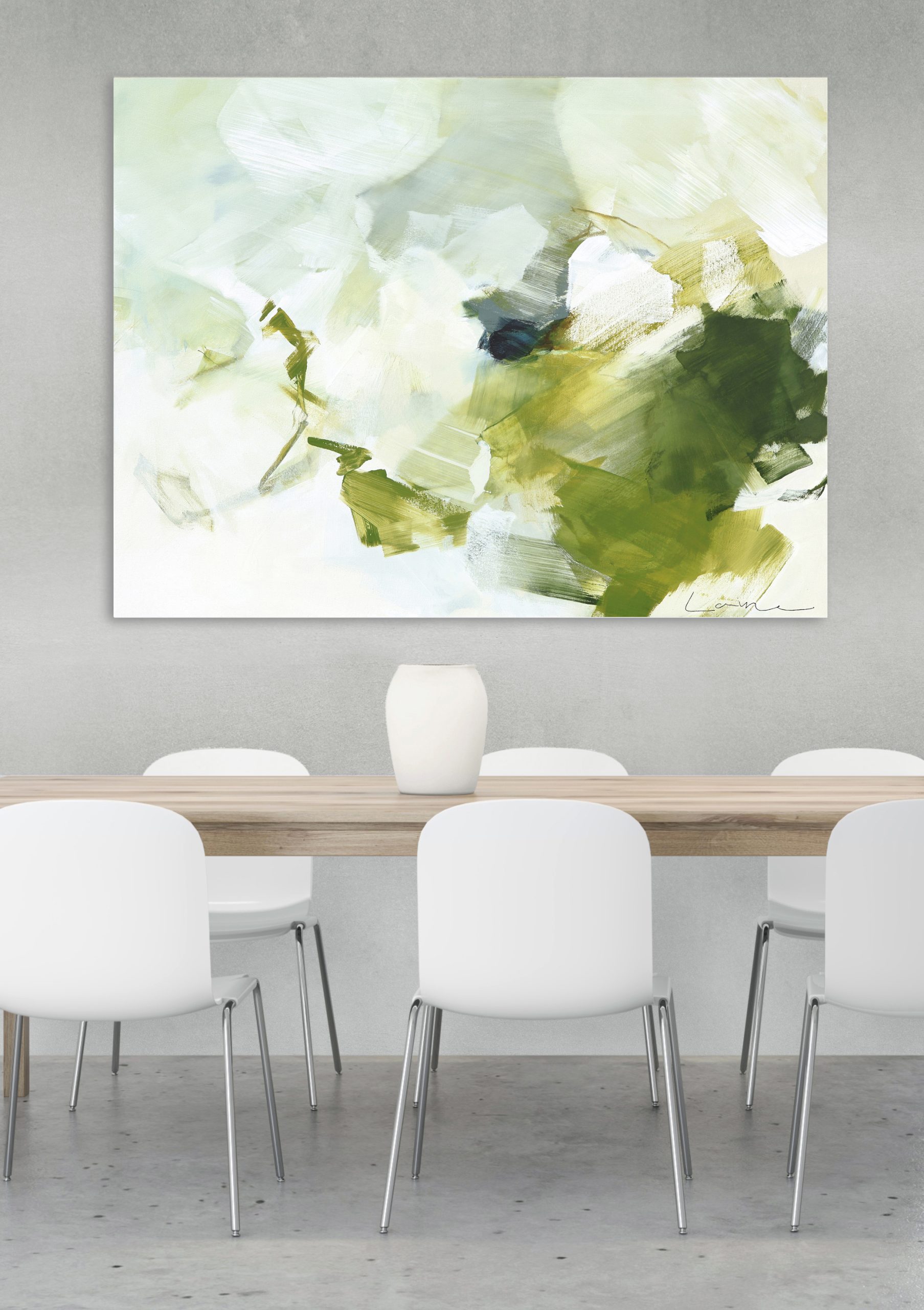 Fusion is a combination of sage and olive greens with washes of grey and beige and a touch of navy. He’s painted on a quality stretched canvas. The image wraps around the 3.8cm sides so Fusion is ready to hang.