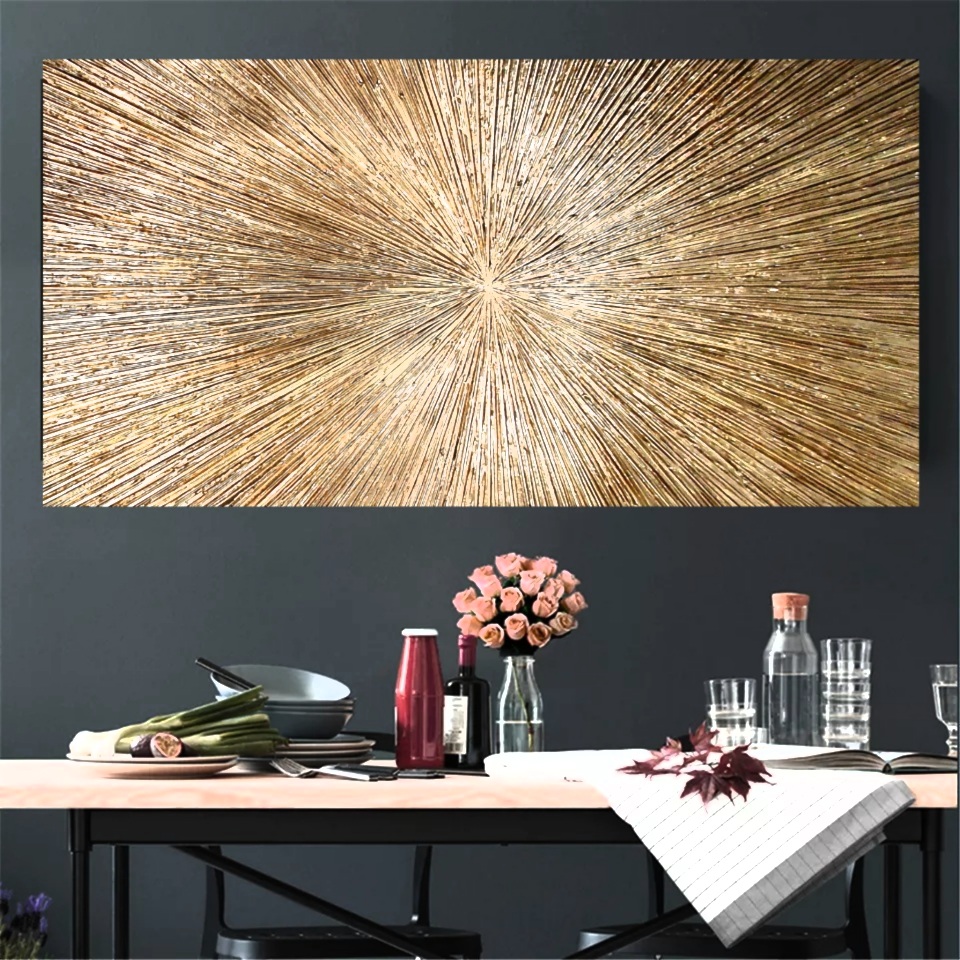 This piece is made by layering modeling paste on canvas and painting with high quality metallic gold spray paint in 24k shades of gold colour.