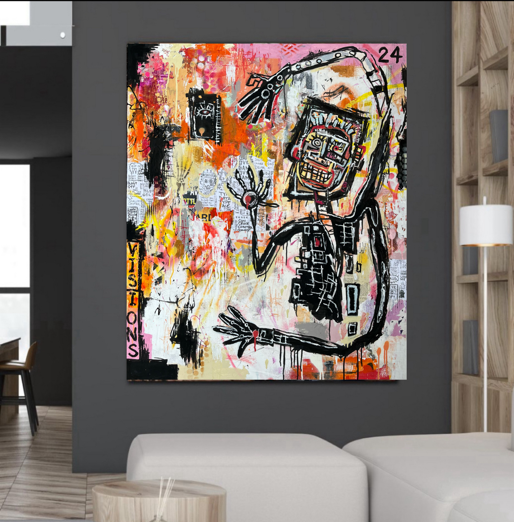 I used spray packs, paint pens and acrylic used to create the work and then the canvas was painted black around the edges and is ready to hang as is. This original Artwork is a continuation of my current series, playfully exploring the merging of Man & Machine.