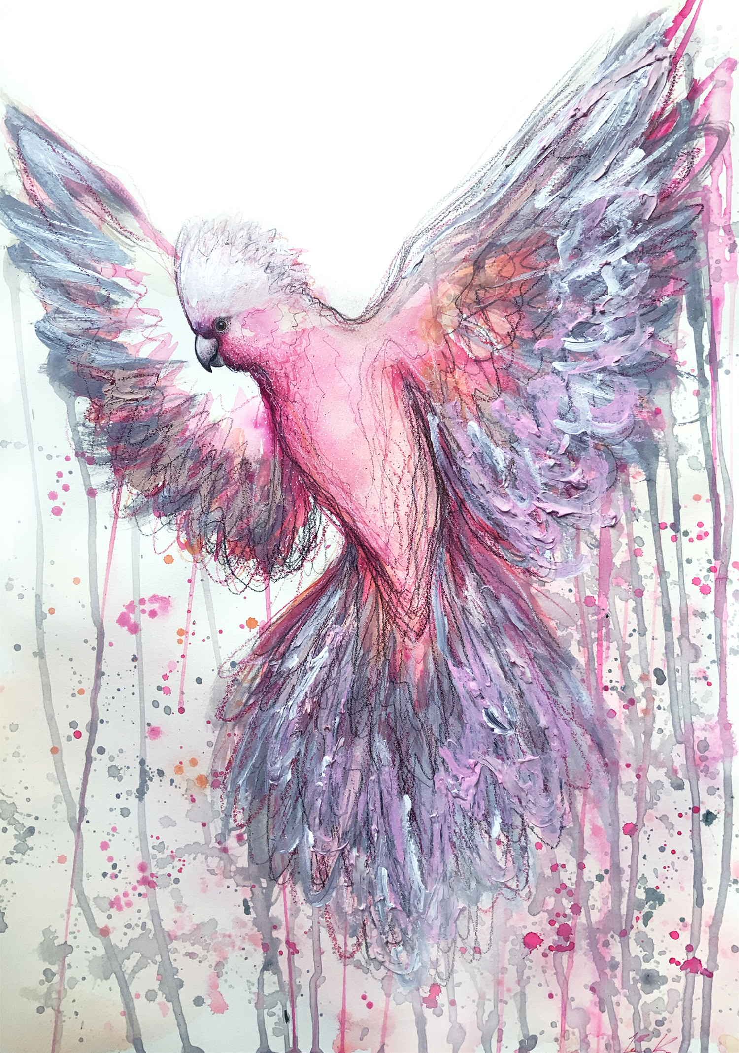 This Galah flying with wings outstretched is by Sydney artist, Leni Kae. From her Animal Spirit Series.