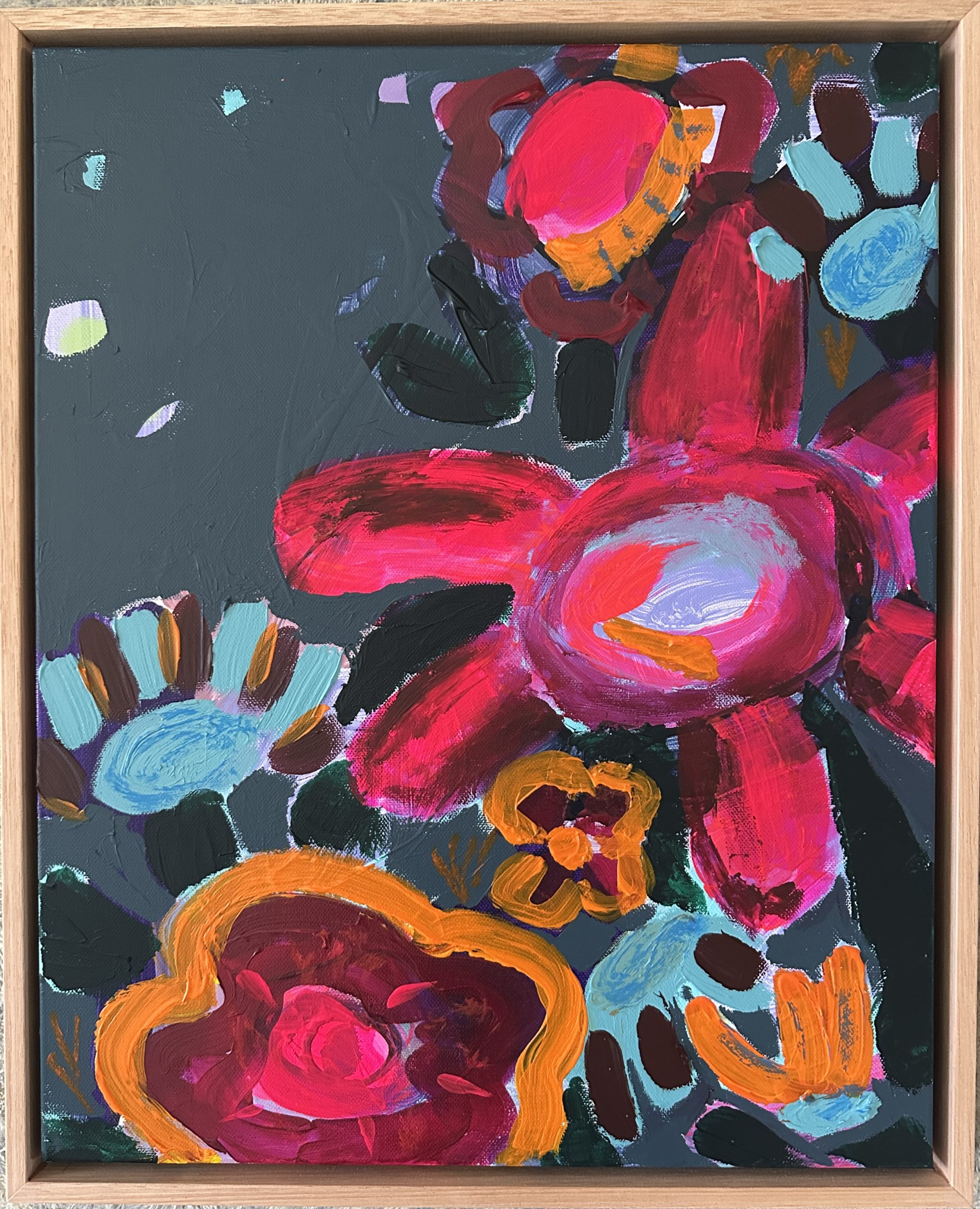 A celebration of colour and chaos, Garden Giggles I is a floral explosion with attitude. Bold crimson, hot pinks, and juicy oranges dance across the canvas, as if the flowers themselves are in on the joke. Thick, textured strokes bring the blooms to life with a carefree, energetic charm. The blue background represents the sea where I live on the Mornington Peninsula