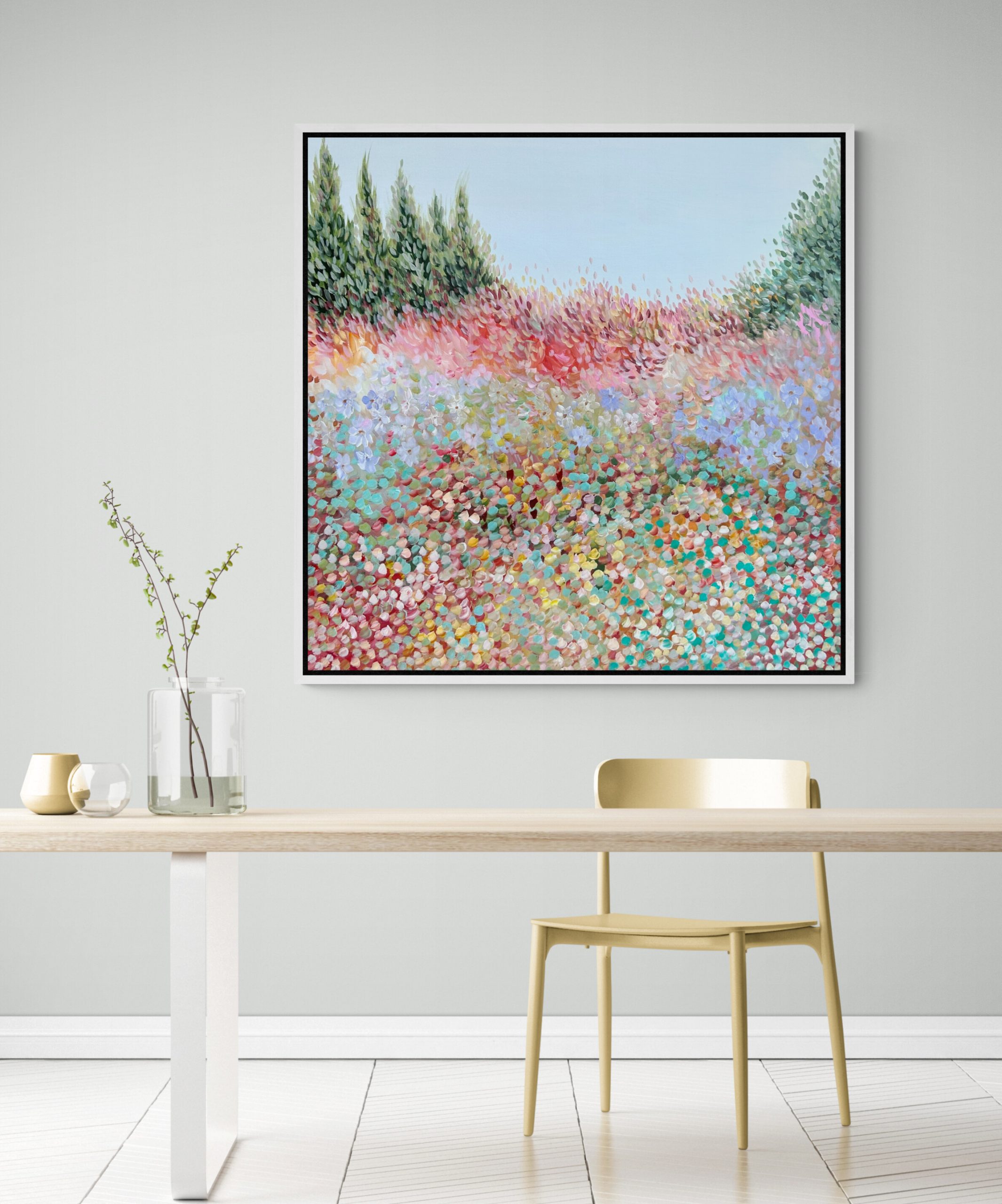 Garden of Eden by Theo Papathomas – Â a painting with lots of layers of beautiful colours of petals covering the garden . The landscape becomes a bouquet of petals dancing over the garden swept by the winds. I tried to create this beautiful composition of colours of the garden of flowers and petals making a beautiful bouquet of colours. Capturing the beautiful colours of the petals, foliage of the trees like musical notes dancing over the garden of Eden . The garden comes to life with the sounds of the petals creating movement and rhythms. The painting does not come with an external frame.The painting is signed and dated 2023 at the back and comes with a certificate of Authenticity.