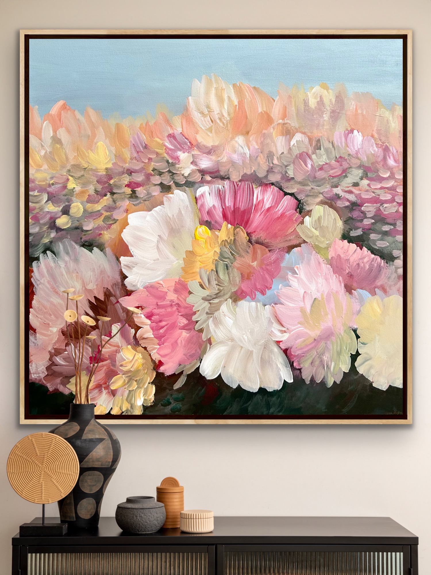 Is a painting with warm and cool colours of flowers and petals flying in the wind, creating a bouquet of petals over the landscape with lots of layers of acrylic paint. Petals weeping over the landscape creating so much movement and rhythms . A very peaceful and tranquil painting with so much depth.