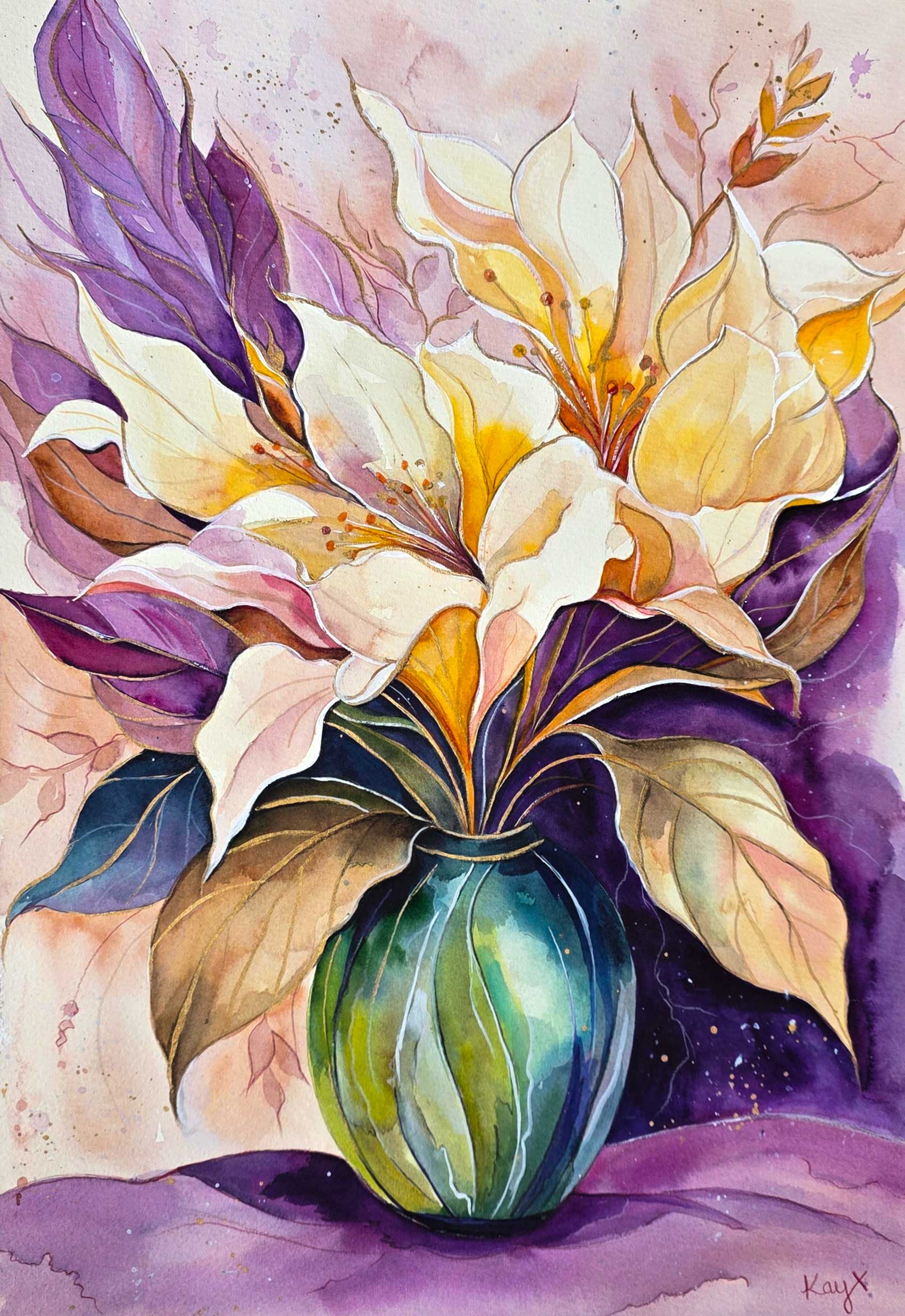 Gathered in Gold by Kay Shanley – is a luminous watercolour celebrating warmth, abundance, and quiet harmony. Creamy petals unfold around glowing golden centres, gathered gently into a hand-painted vase, where soft purples and plums create a sense of calm and depth.