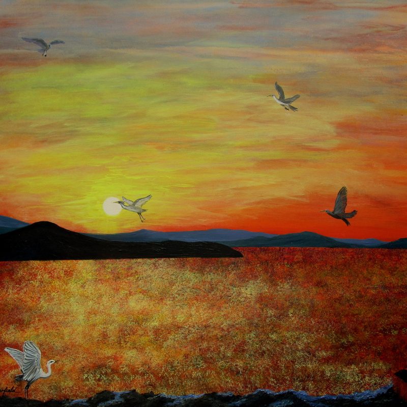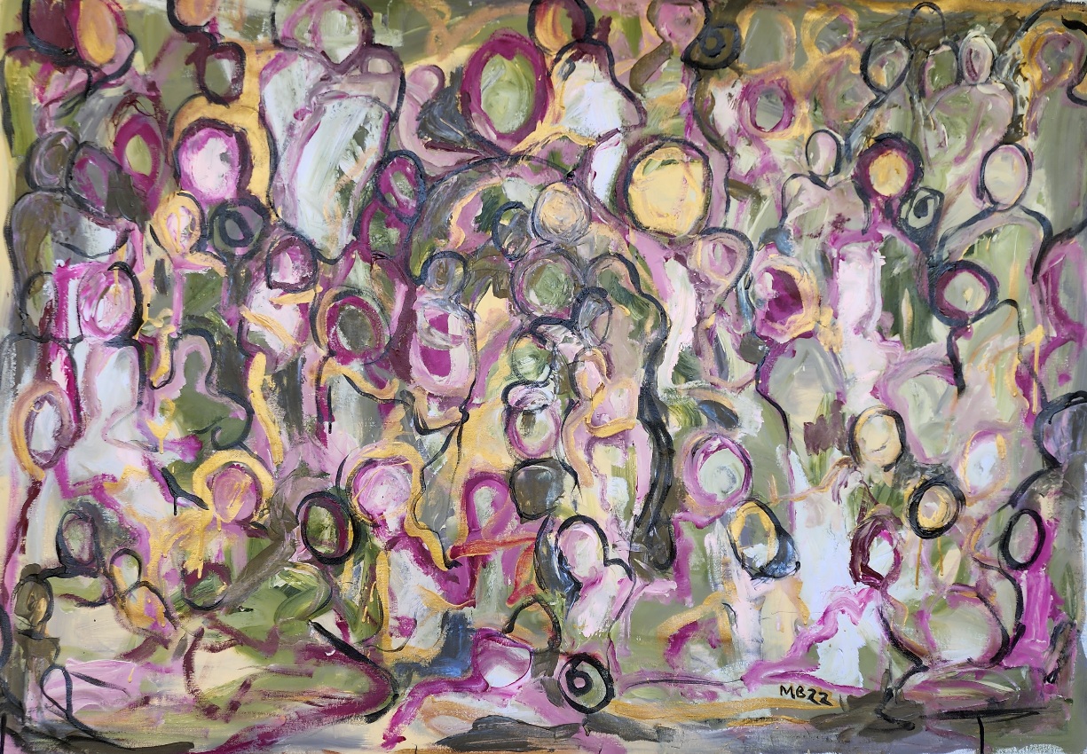 This abstract expressionist piece, ‘Gatherings 2″, a follow on in from Gatherings’ was created using my own technique of laying down colours and then using my gift of Pareidolia to find human formations within the seemingly abstract painting. I usually find figures in my work without trying. I think this is due to my interest in life drawing and the human form.