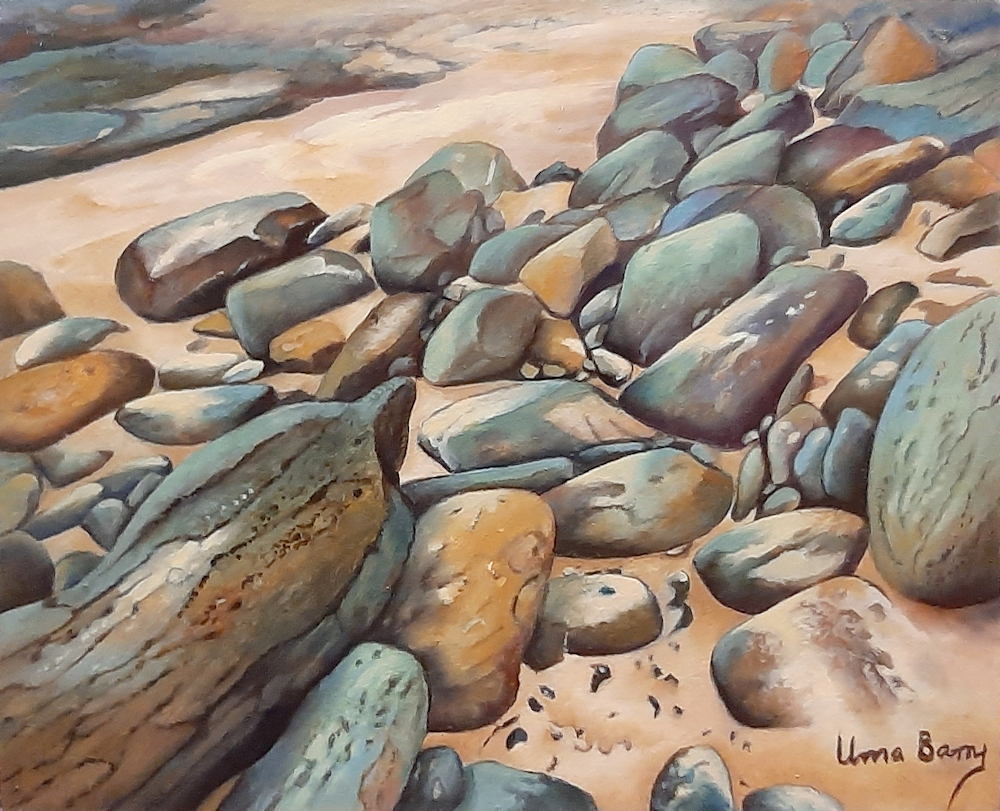 Gems of the beach by Uma Barry – Hi everyone, here is a piece that gives a wonderful vibe of the beach filled with little treasures we tend to ignore when we are having fun. Their colours, shapes and sizes add so much more character around these special places we call paradise. Hope you like this 26x20cm oil piece which I had fun creating. It comes with a wire backing and certificate of authenticity, all ready for your wall. Thank you so much for all your kindness in viewing my artwork. Hope you like this special piece which is 26x20cm in size. It gives a wonderful vibe of the beach with beautifully coloured pebbles in sizes which we tend to miss admiring when we are there.