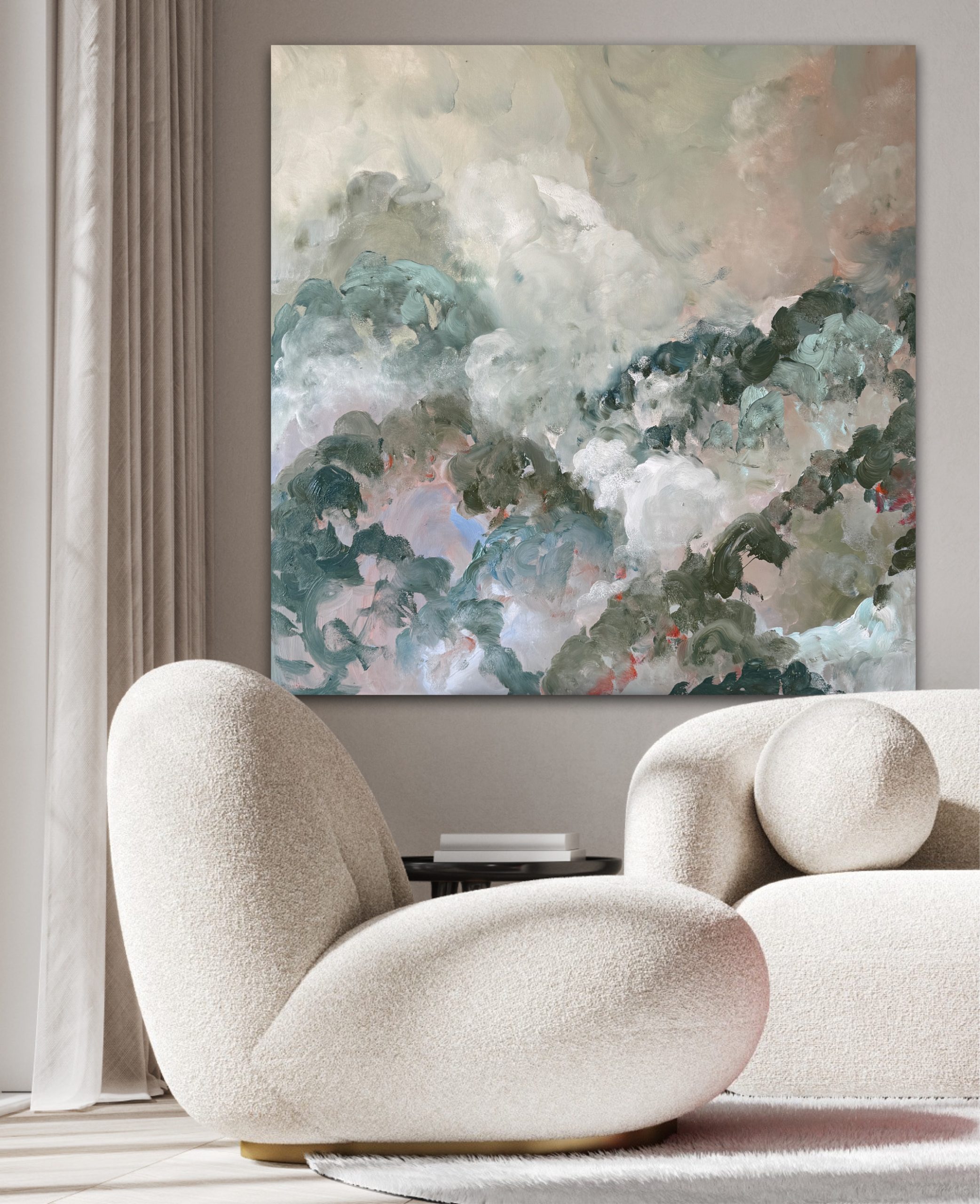 Soft layers of muted green, blush and blue drift together like morning mist over distant hills. A serene, dreamlike piece that brings calm and quiet beauty to any interior.