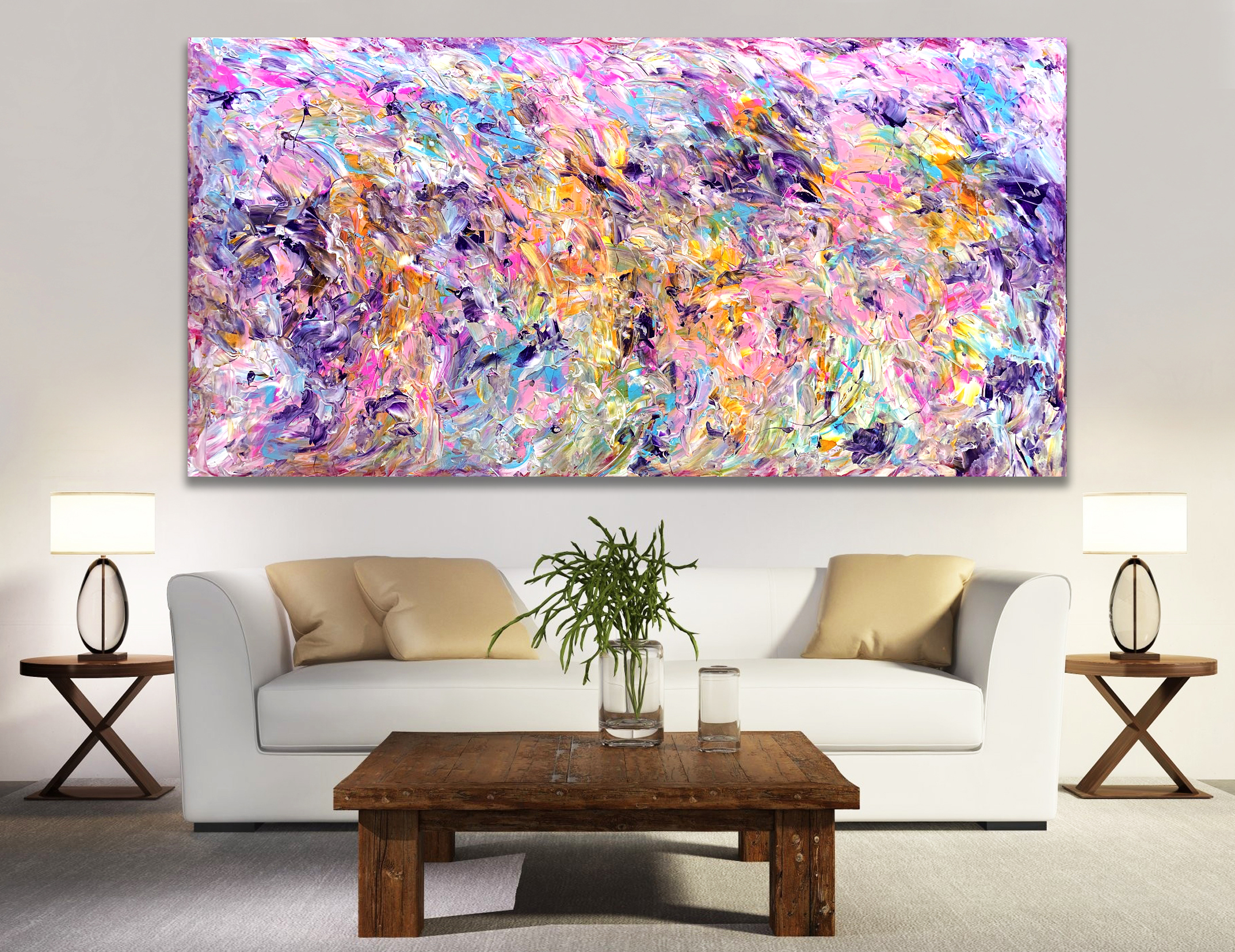Painted on professional-grade canvas and has been sealed with varnish. The canvas has the dimensions 91.4 cm height x 182.9 cm width. The work has sections that are impasto (thick paint), while the sides are painted white and so there is no need for a frame.