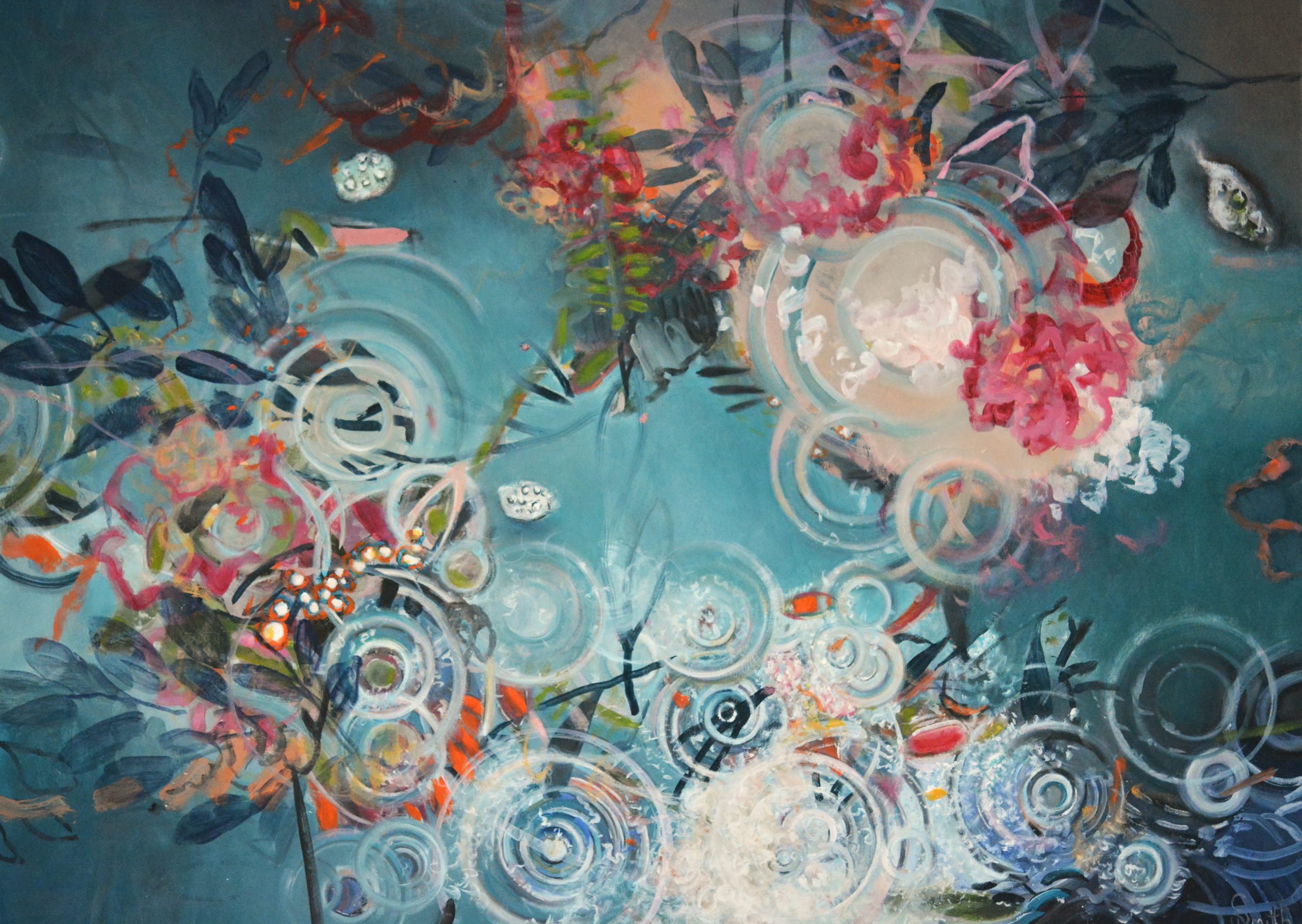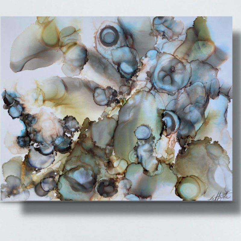 “Gentle rain” by Dianne Smith is inspired by raindrops descending on the water’s surface in a tiny section of my local creek. These delicate lacelike ripples blend, weave and dissolve into random and captivating patterns. As fluid circles fall they highlight the elegance and complexity found in the fleeting and the temporary.