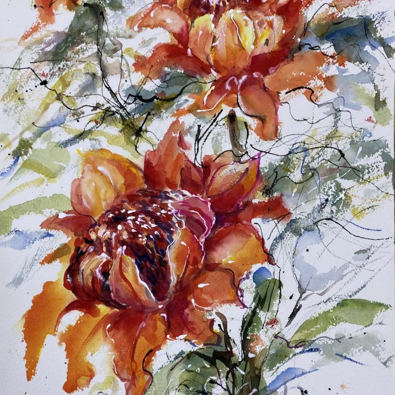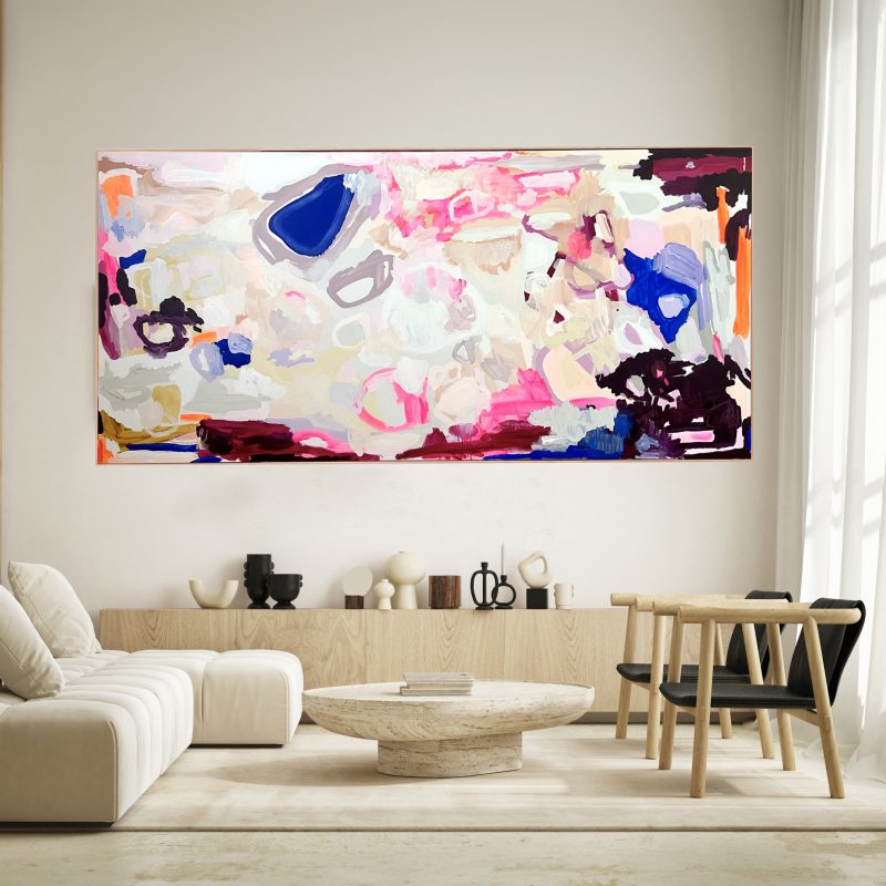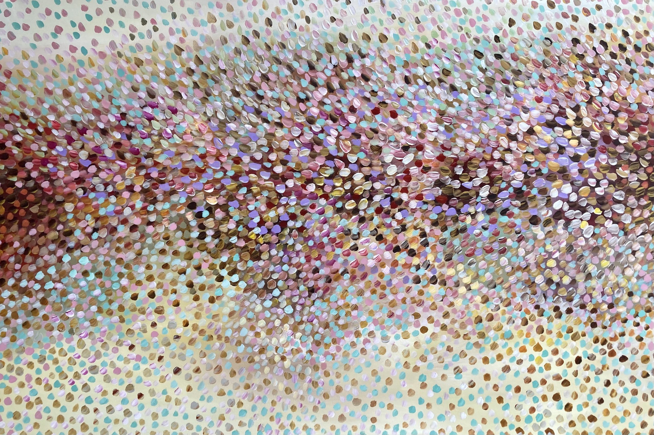Gentle Touch by Theo Papathomas a painting with soft colours of the petals flying in the wind creating this beautiful bouquet of petals in the sky with lots of layers of paint. Beautiful flickering petals dancing over the sky shining like stars. Petals weeping onto the landscape creating this veil of petals covering the sky in soft pastel colours . A composition of colours and rhythms of petals dancing like musical notes in the sky making this painting very gentle and poetic . A very peaceful and tranquil painting with so much depth. The painting does not come with an external frame.The painting is signed and dated 2021 at the back and comes with a certificate of Authenticity.