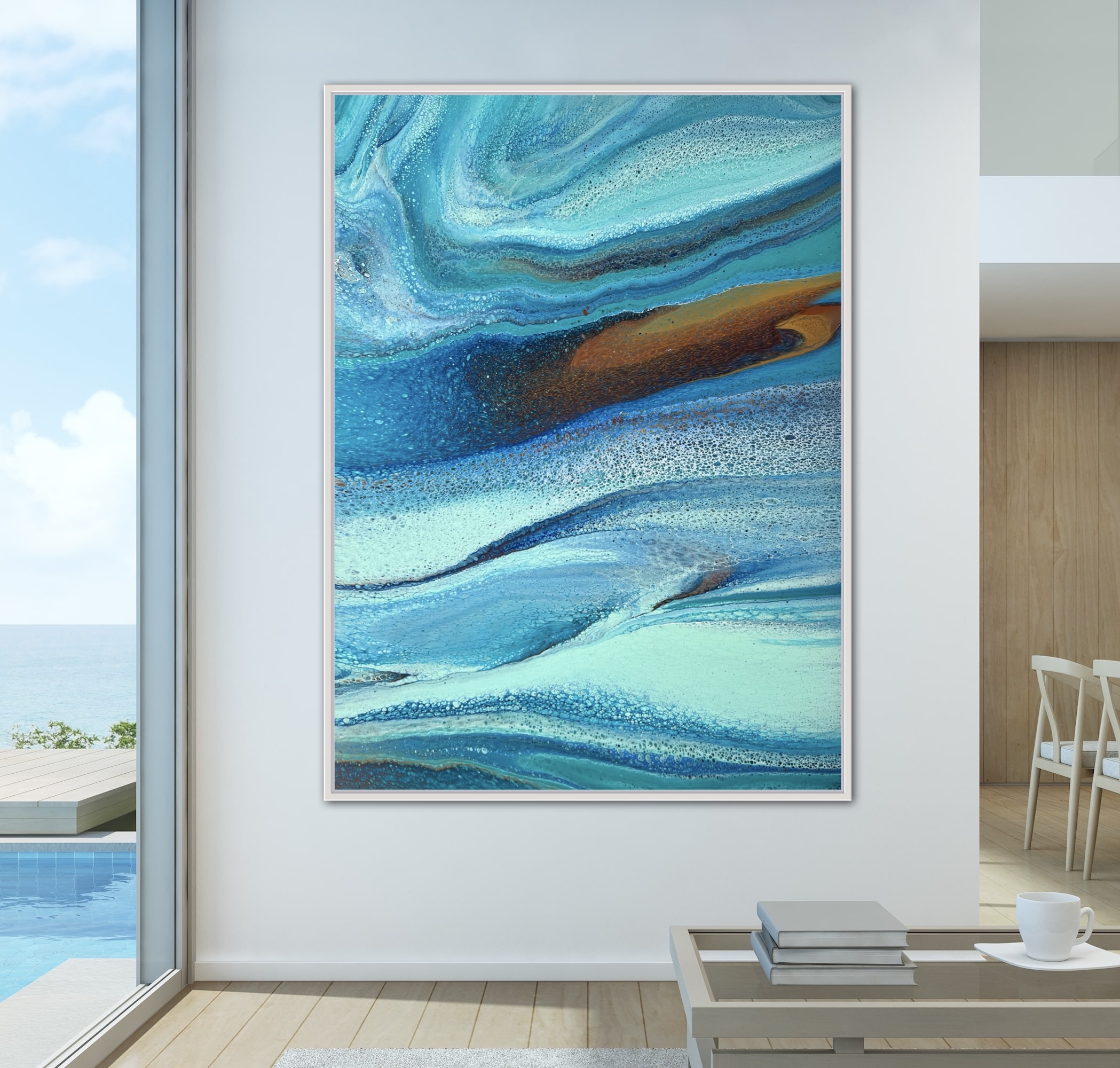 Gently Flowing was created using various techniques combined to allow increased flow, interaction and separation of colours to create interesting patterns where pops of colour can be seen emerging from underneath. This added dimension adds lace and cells to the artwork creating an interesting and one of a kind painting that can never be replicated. The metallic paint used reflects the shifting light beautifully really bringing the painting to life.