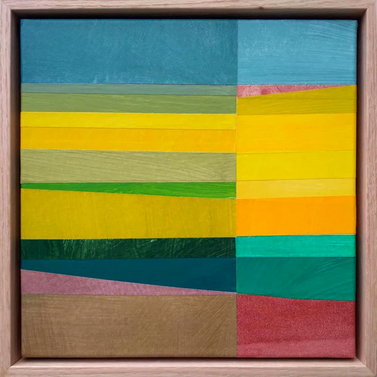 Geometric Bliss – abstract landscape by Bozena Wiszniewski – Â This vibrant piece invites you to explore a landscape of colour and form. Each section, meticulously crafted, showcases a harmonious blend of hues that evoke the beauty of nature. The layered composition creates a sense of depth, drawing the eye across the canvas and inviting contemplation. The warm yellows and cool blues play off each other, while the earthy tones ground the piece, making it a perfect addition to any space.