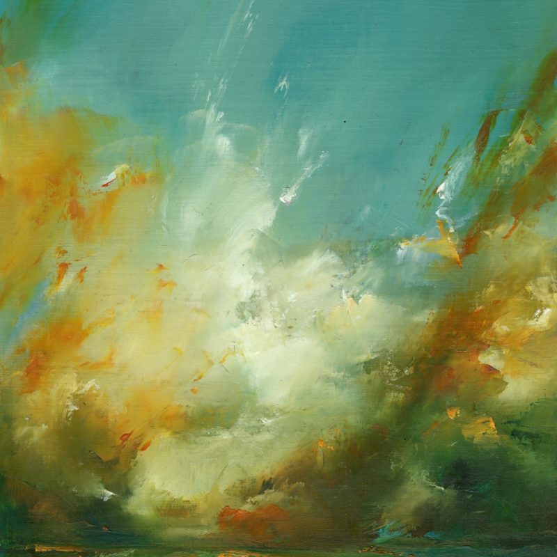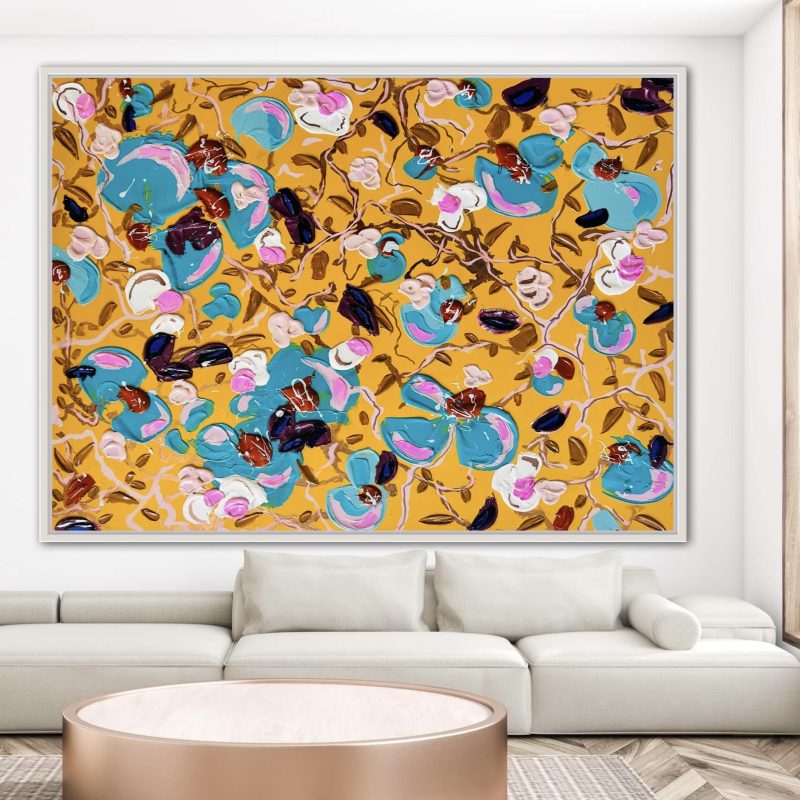 Geometric Illusion by Tara Cunniffe – Abstract, geometric oil on canvas painting with hues of yellow ochre, coral and brown. Birds of paradise flower ideology painted in geometric euphoric scenes of landscapes with three dimensional triangular angles incorporated with intense tonal brushstrokes. Exploring the many layers and depths of identity, life cycles and experiences through geometry and hidden interpretations. There are connecting points from all angles and each triangular prism signifies a projection of journeys within the subconscious mind. One abstract triangle within the painting signifies a crocodile eye which evokes a sense of being watched, alertness and being in control of life and your surrounding prey.