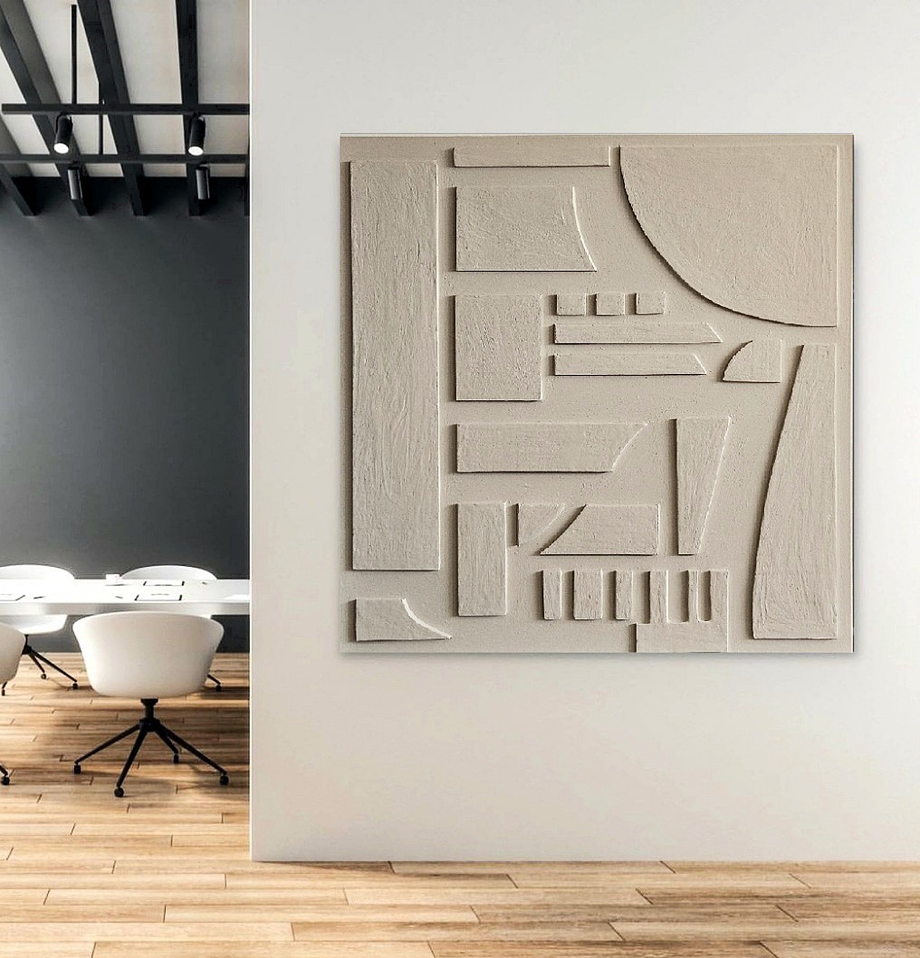 This artwork has been created by cutting geometrical patterns from polystyrene foam material, dipped in a plaster mixture and arranged on an canvas in different patterns .