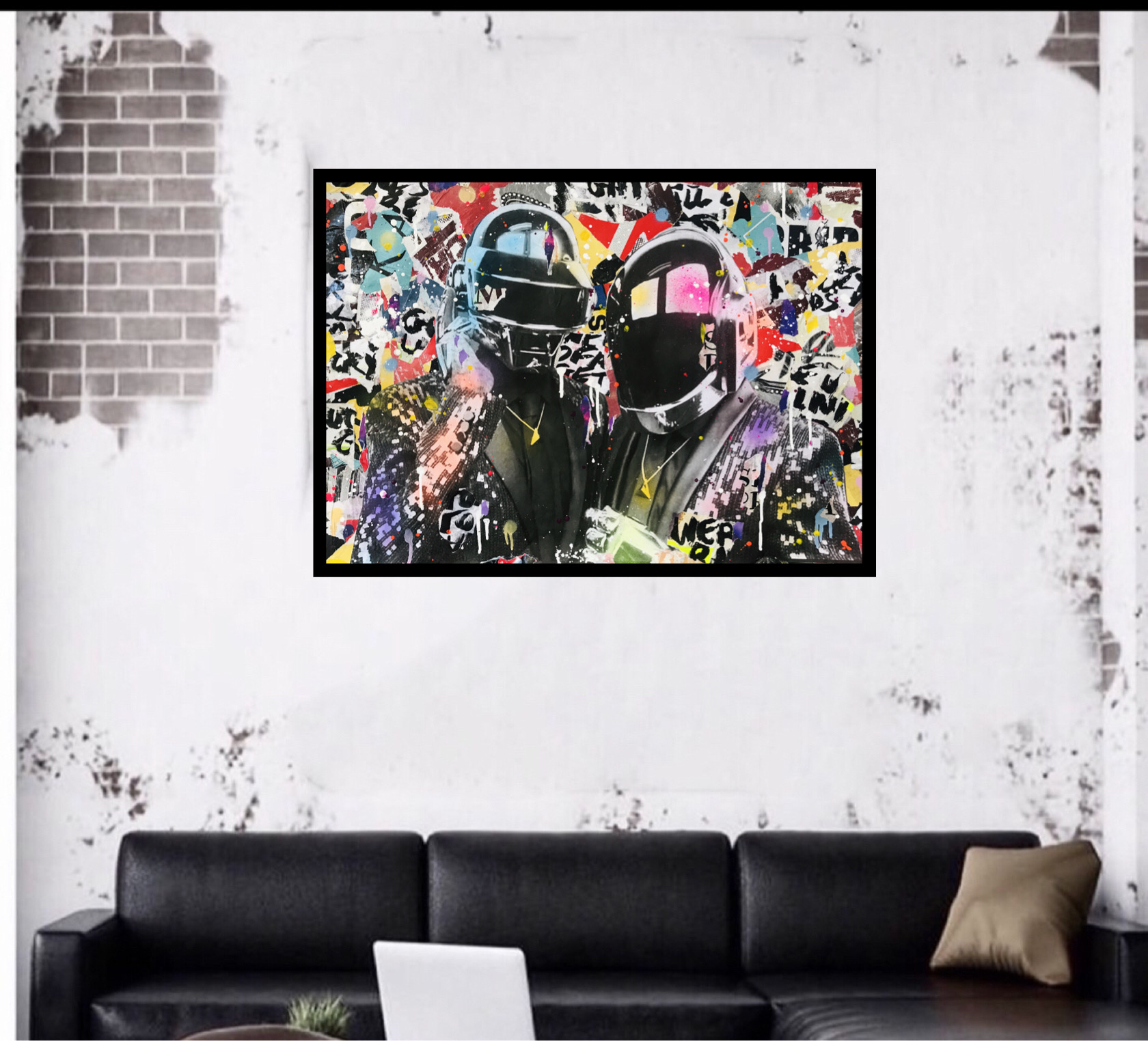 The main vintage image of Daft Punk was added and overlaid with a paper and paint