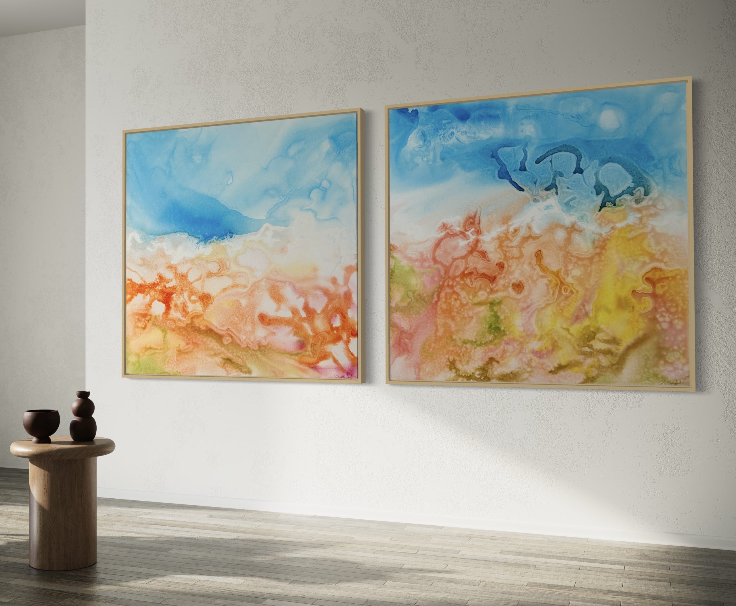 The artwork is thoughtfully encased within a natural timber frame, serving as a delicate border to the explosive creativity within. The juxtaposition of the organic timber against the vivid ink hues creates a balanced harmony, grounding the abstract exuberance in a touch of nature. This diptych painting not only captivates with its colour palette and abstract expression but also draws attention to the craftsmanship of its presentation, making it a truly immersive visual experience. Signed certificate of authenticity.