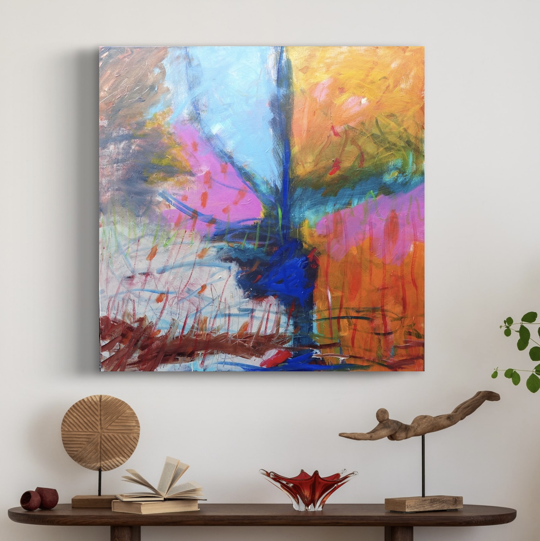 Artist Statement: Ghostly Boab is an expressive abstract interpretation of the iconic boab tree. Radiating with energy and layered emotion, this painting captures the tree’s strong, haunting presence against a shifting sky. Vibrant hues of orange, pink, and cobalt blue suggest the heat of the land and the ethereal glow of dusk, when the boab begins to feel more like spirit than tree. This work invites viewers to feel rather than see— the sacred in nature. This work is part of my new series of Ghostly Trees.