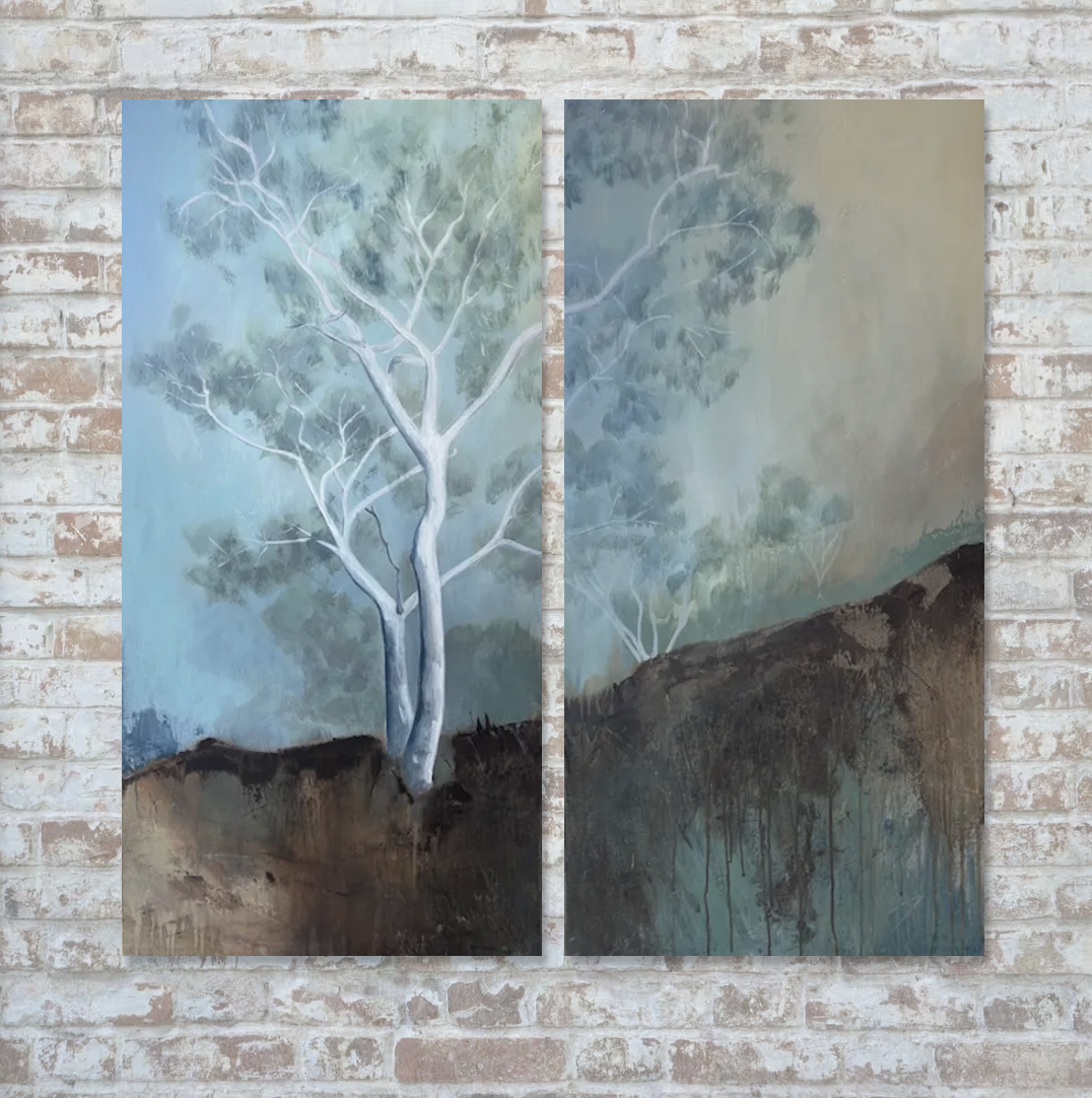 This painting draws inspiration from the spectral presence of Australia’s native ghost gums—trees that seem to shimmer between worlds with their pale bark and silent grace. In many ancient spiritual traditions, nature is understood to be alive with sacred presence. In Japan, the concept of kami speaks to this: spirits that reside in natural earthly elements while also existing in another realm.
